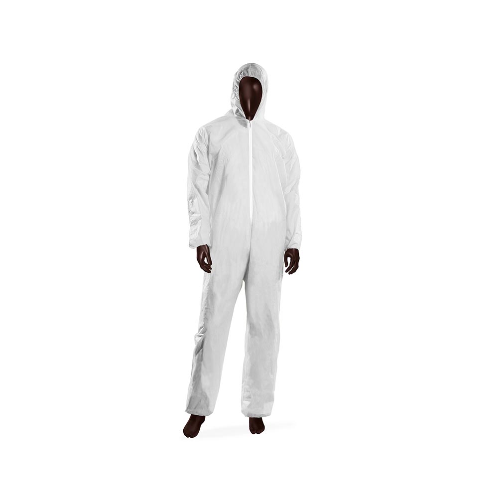 Materiale: PLP (polipropilene) Colore: bianco Design: elastico al cappuccio, ai polsi e alle caviglie; chiusura con cerniera frontale Taglia: unica Confezione: 50 pezzi per scatola