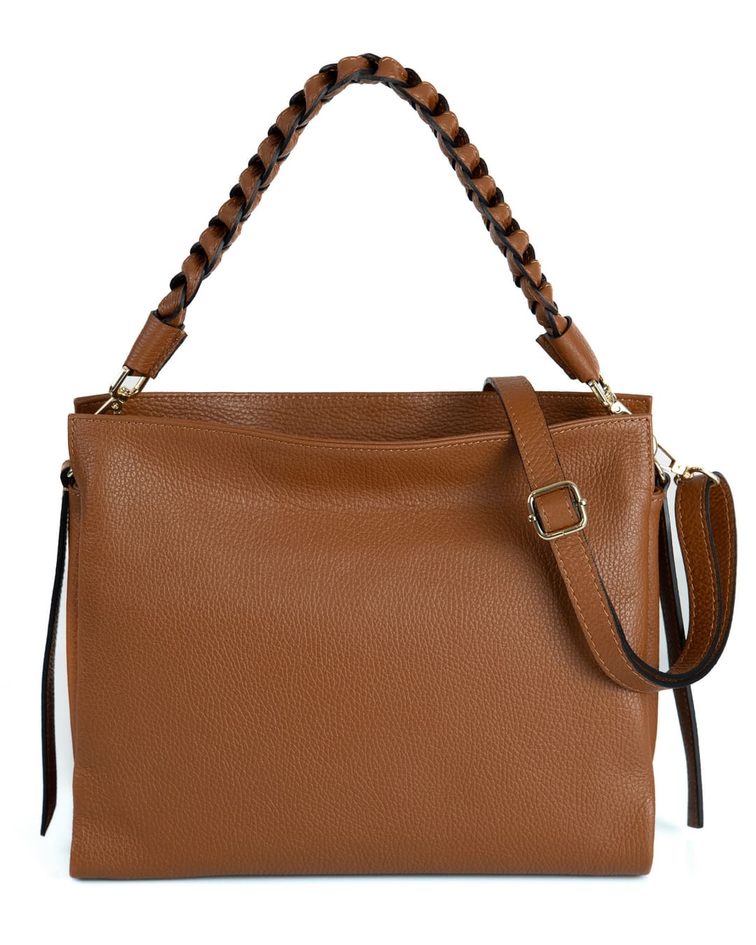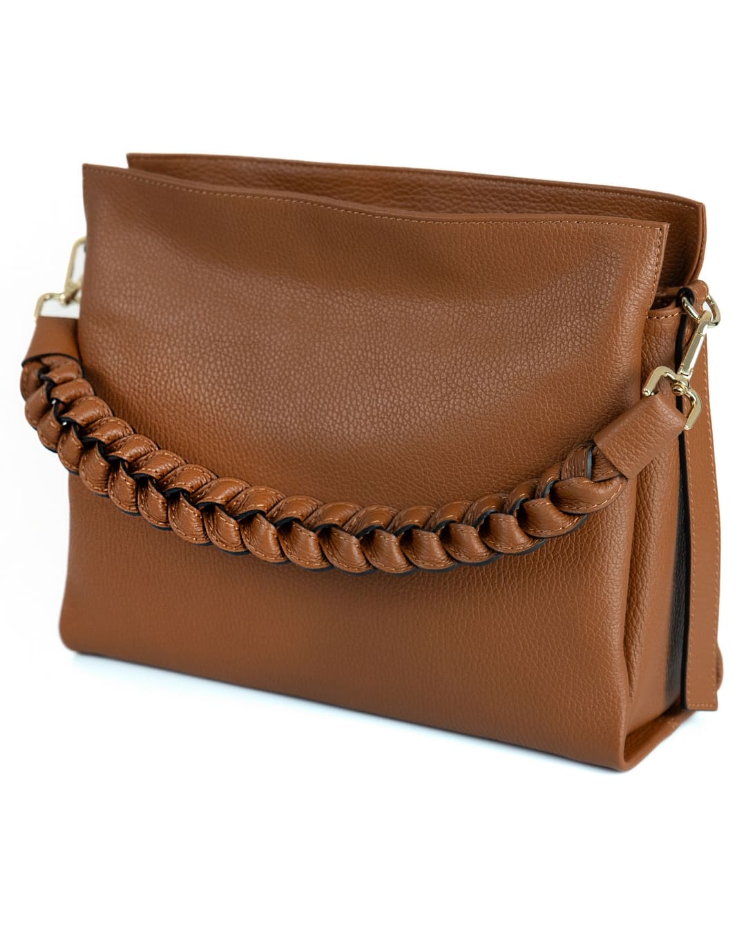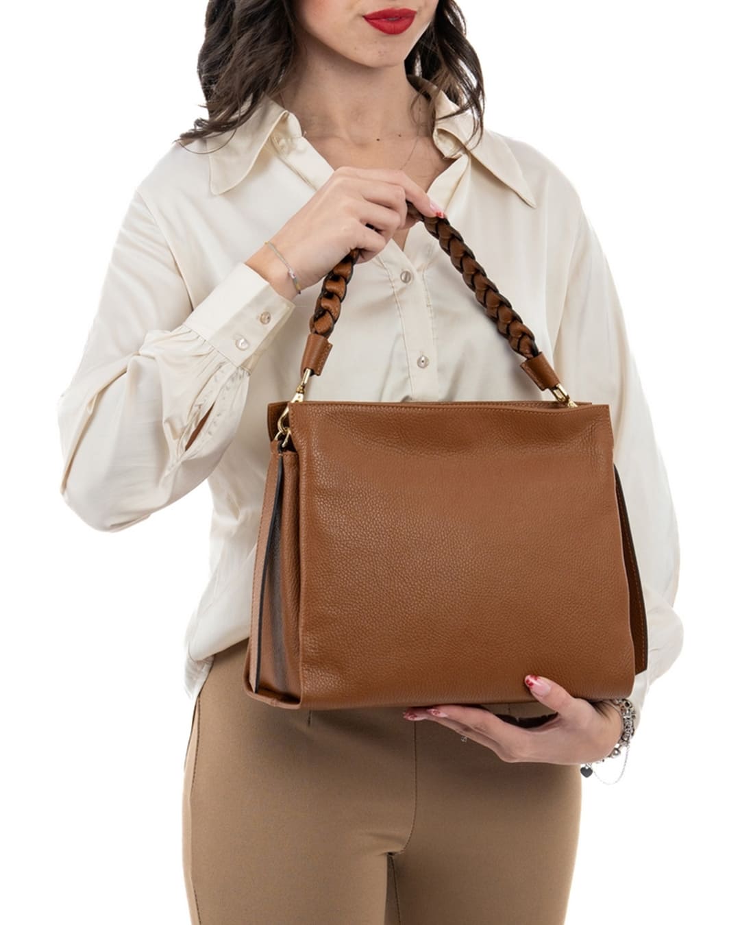 AGATHA Borsa a spalla in vera pelle martellata colore cuoio con manico intrecciato e tracolla