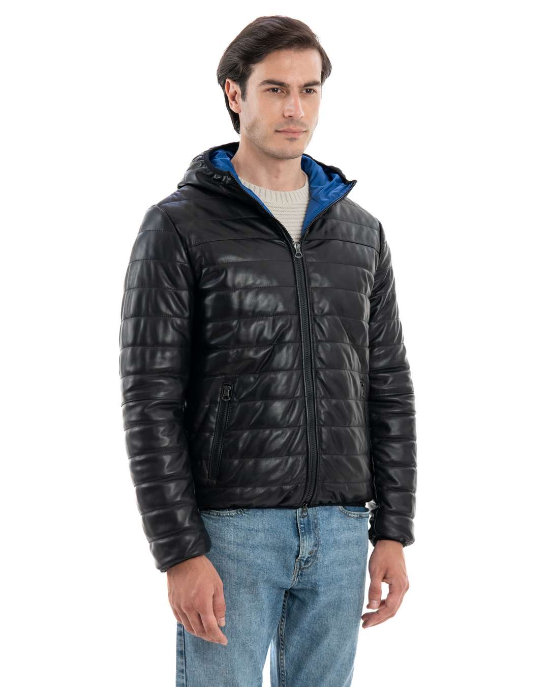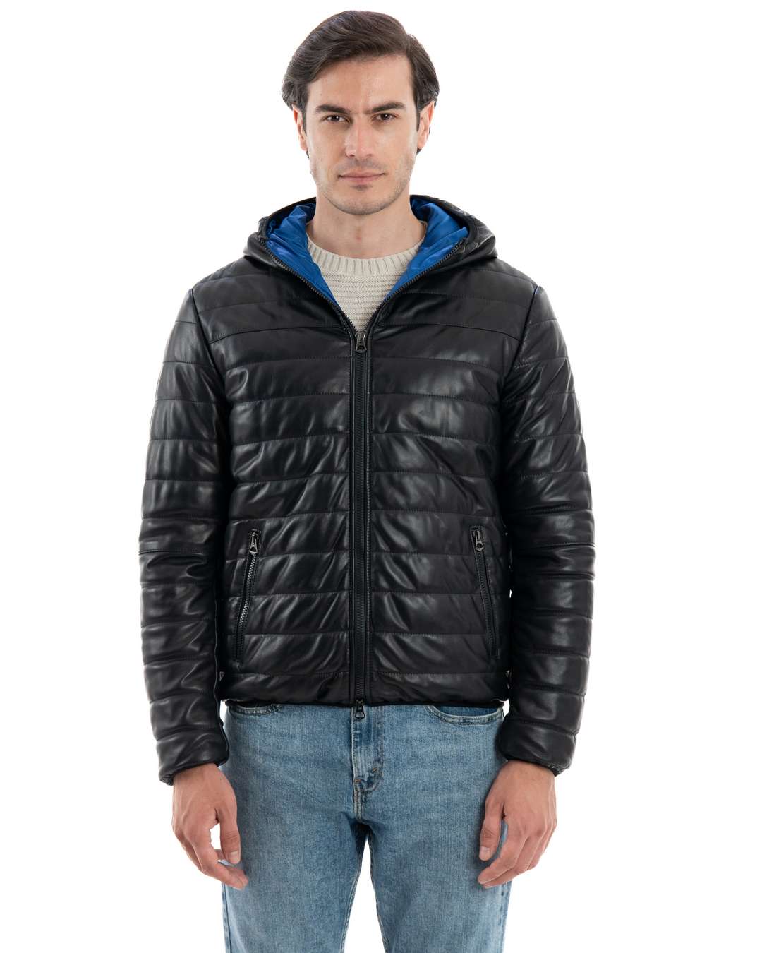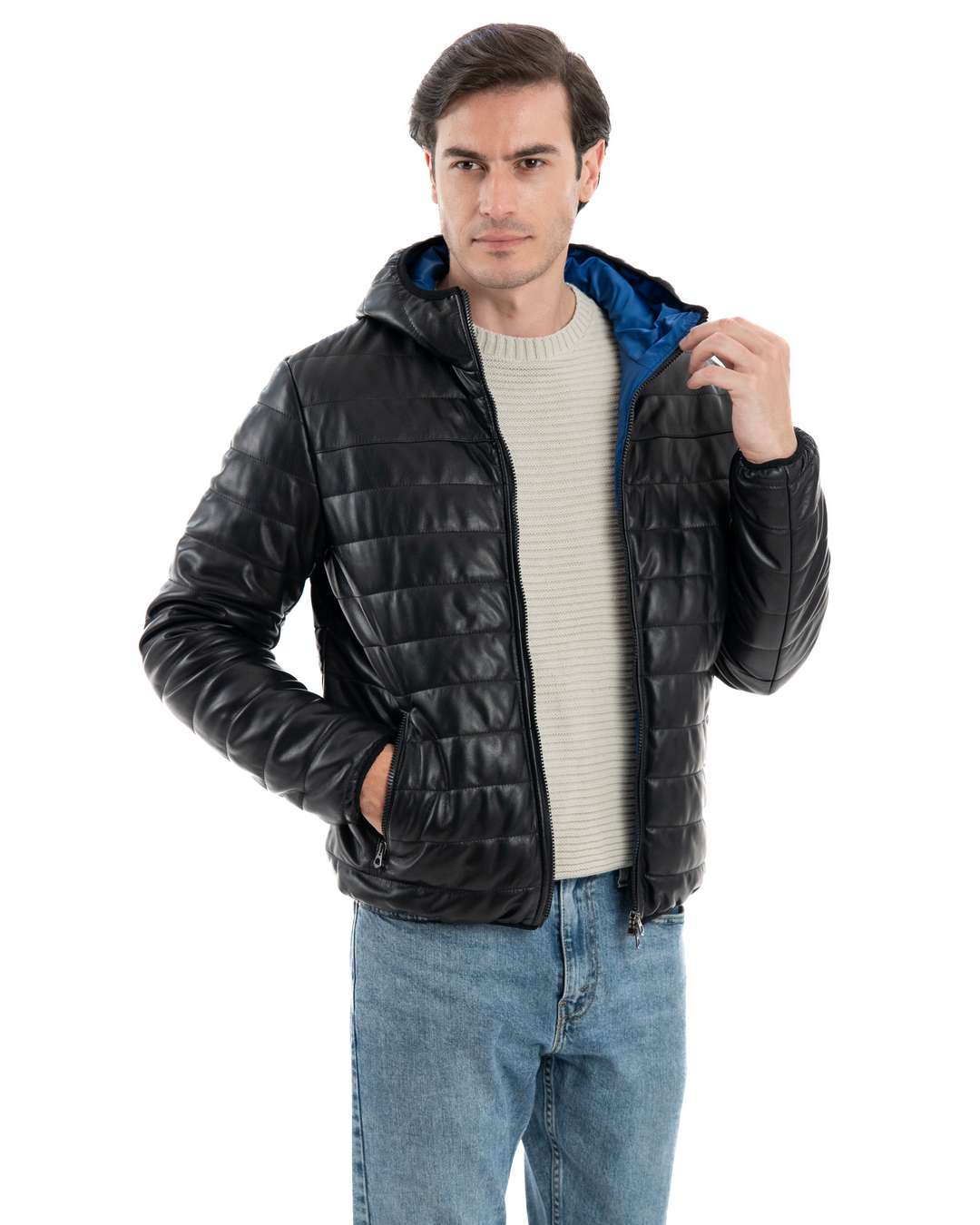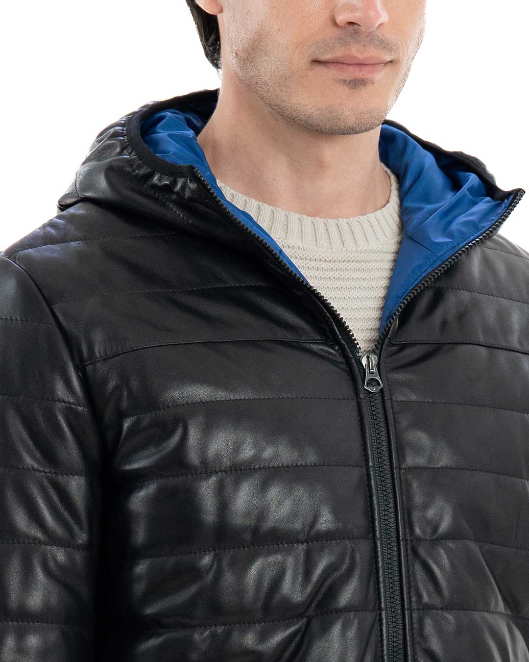 ALEX Piumino con cappuccio da uomo in vera pelle nero