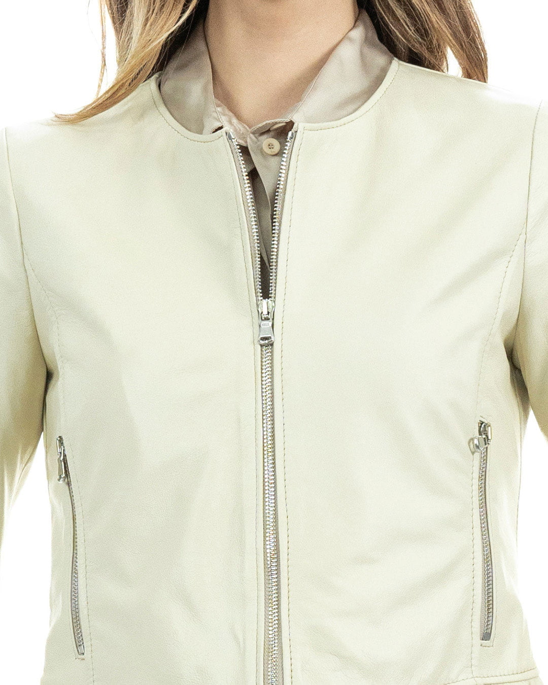 Scopri la Giacca da Donna modello AMBRA, un capo realizzato artigianalmente in Italia che unisce eleganza e stile contemporaneo. Questa giacca in vera pelle panna è pensata per chi desidera un look raffinato senza rinunciare al comfort.