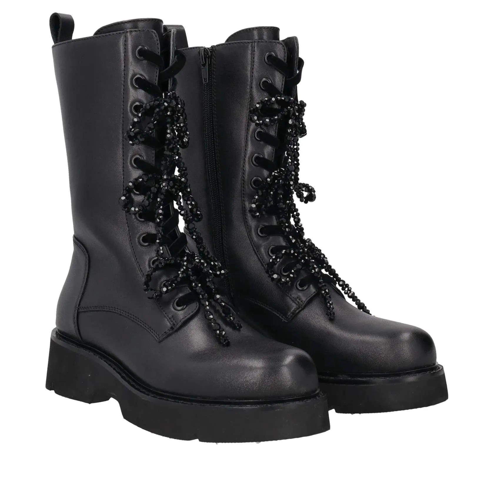 Anfibi Louise Tosca Blu in pelle nera: eleganti e audaci, con lacci impreziositi da fiocchi fatti di perline nere. Un mix perfetto di stile rock e glamour.
