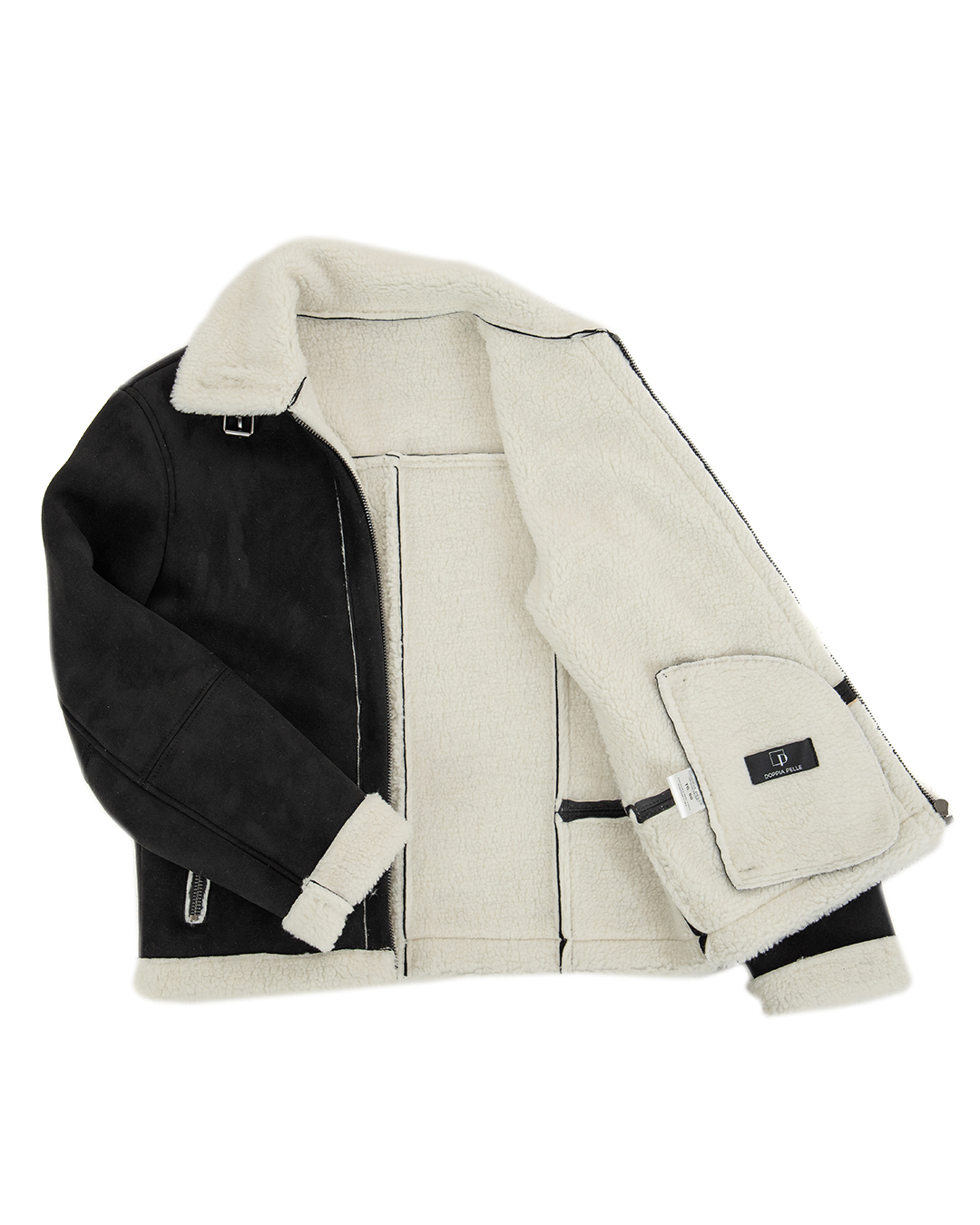 - Tessuto Effetto Shearling Scamosciato: Il tessuto shearling scamosciato conferisce al bomber un aspetto unico e alla moda, perfetto per un look contemporaneo.