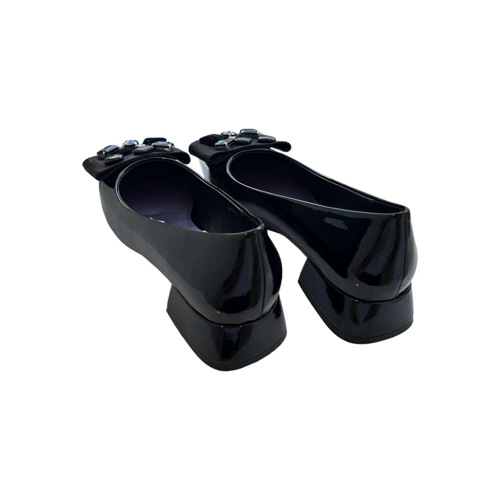 Ballerina in vernice con tacco da 3 cm, accessorio con applicazioni sulla punta, plantare imbottito.
