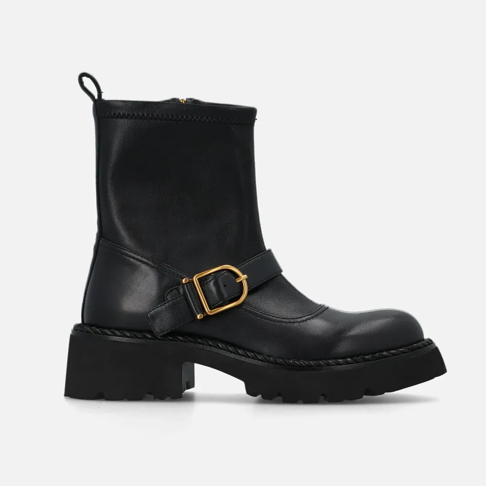 Bikers Fib Dol Bruno Premi in pelle nera con fibbia decorativa, suola carrarmato con treccia e design grintoso. Ideali per look urban e casual.