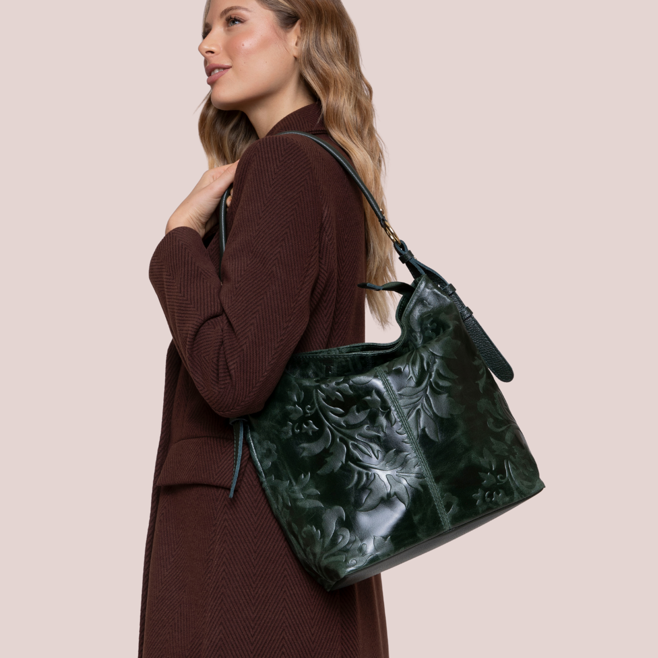 Metti in spalla un tocco di artigianato che racconta la tua essenza. Immagina la sensazione della pelle pregiata sotto le dita, il leggero rilievo del motivo floreale che aggiunge carattere e profondità ogni volta che la tocchi. Questa borsa a spalla in pelle lavorata è pensata per te: per i tuoi gesti quotidiani, le giornate piene, i momenti da fermare in uno sguardo. La pelle lavorata riflette la luce con discrezione, mentre la sua forma morbida e capiente accoglie tutto ciò che ti serve, senza peso, senza sforzo. Indossala su una giacca sartoriale per andare a lavoro, oppure su un…