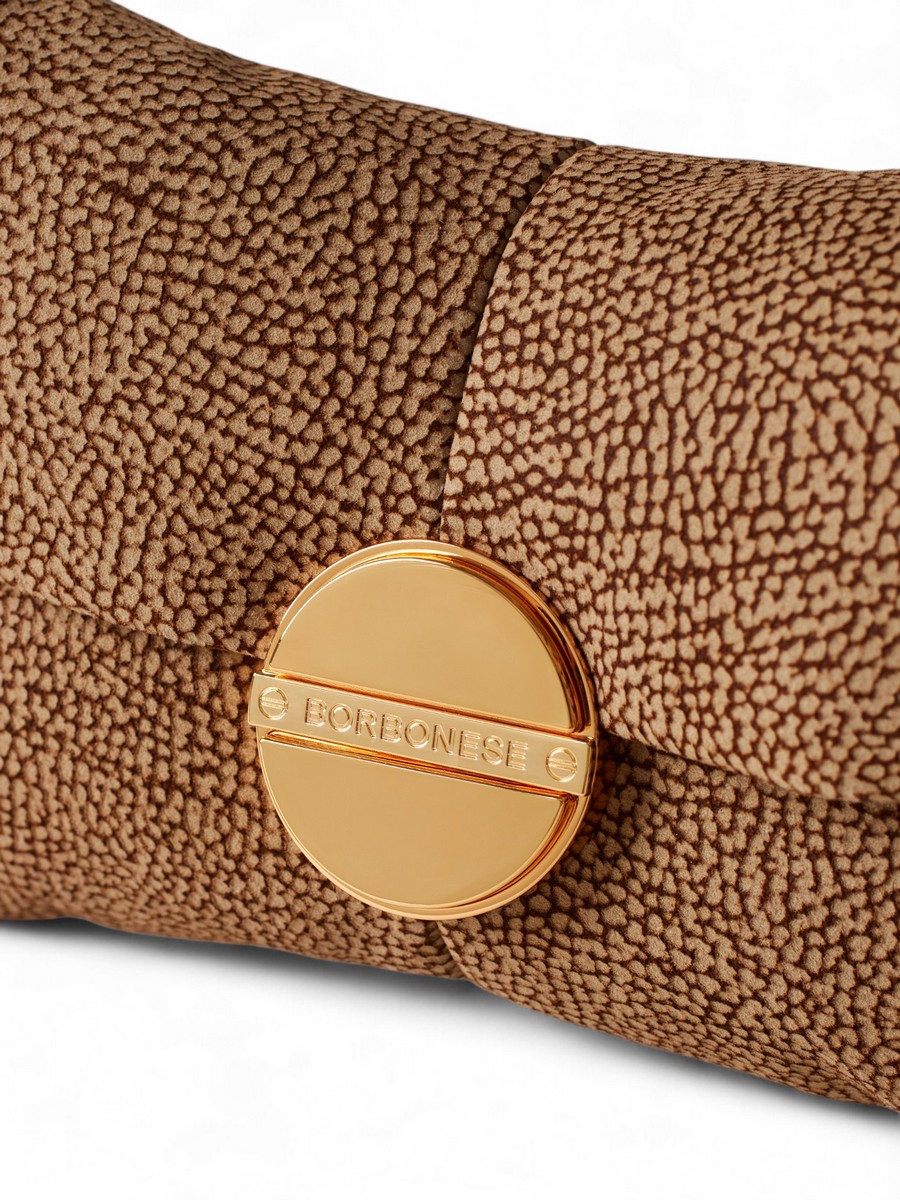 - Dettagli: interno foderato in tessuto jacquard riciclato con taschino a parete, metallerie in acciaio color oro.