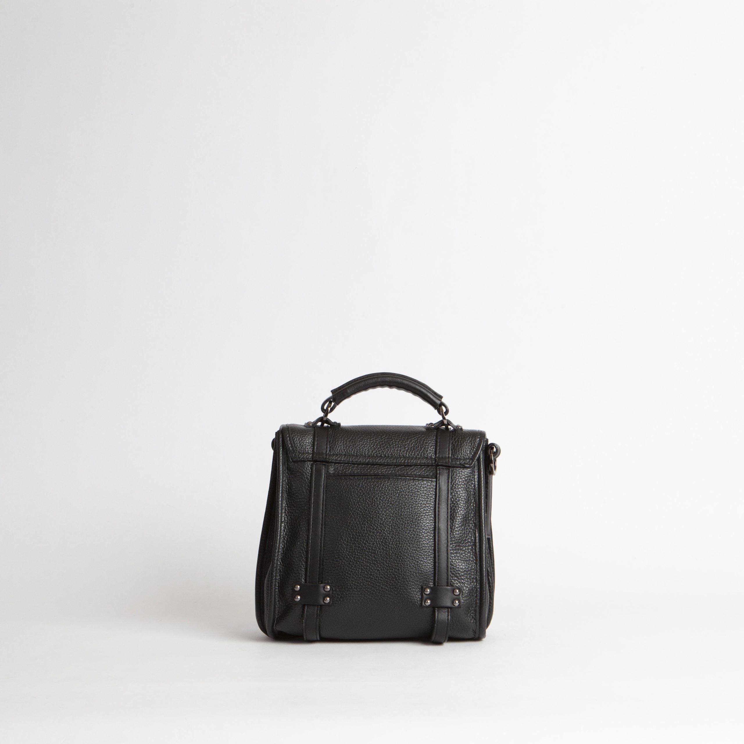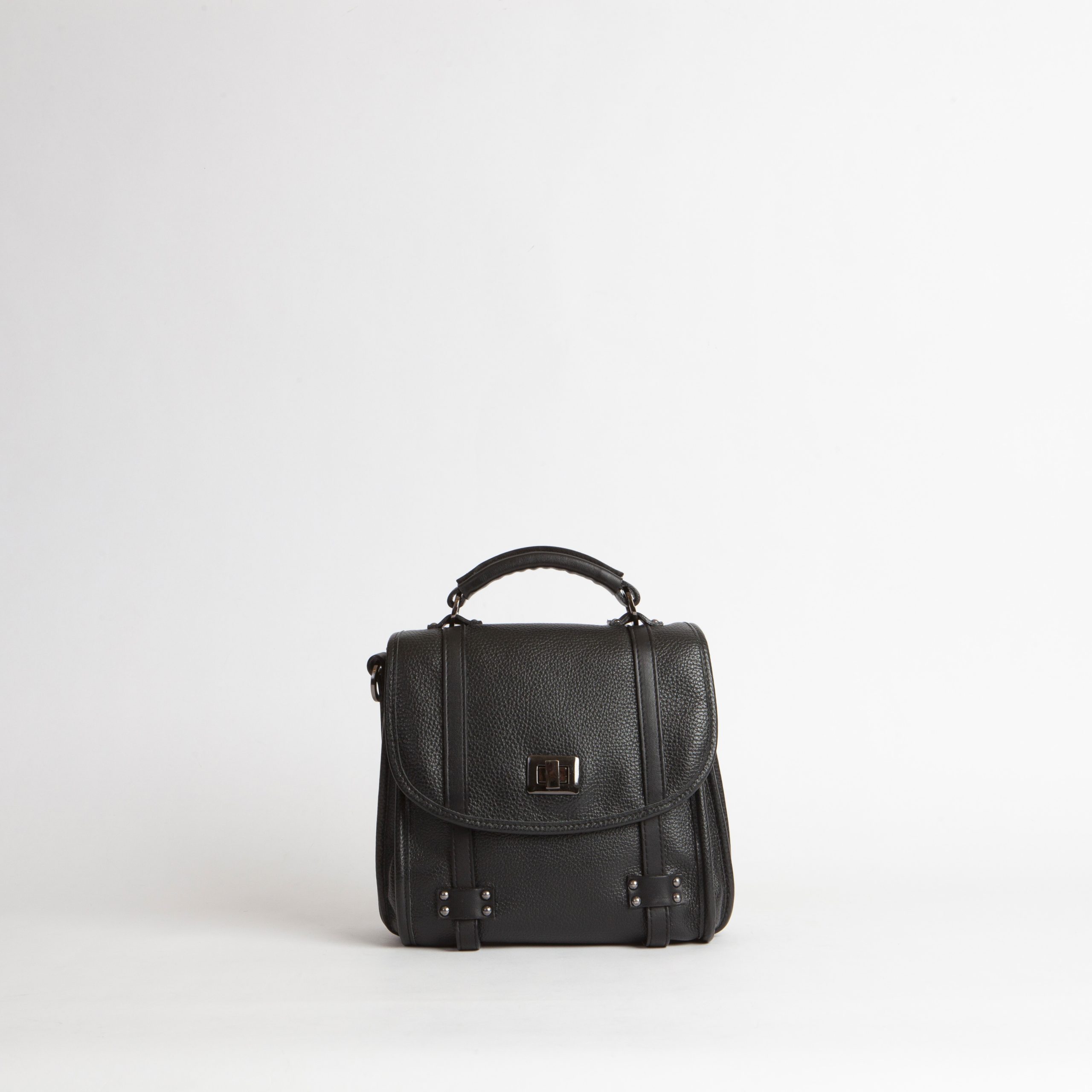 borsa con manico e tracolla regolabile diviso in tre scomparti chiusi da pattina all’interno due tasche in pelle nello scomparto frontale e una tasca con zip nello scomparto posteriore una tasca esterna sul dietro 100% vitello