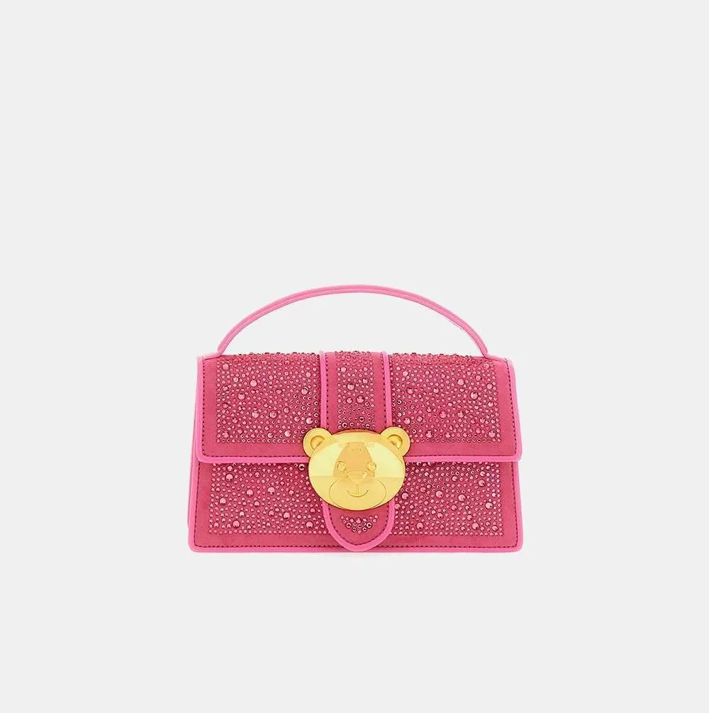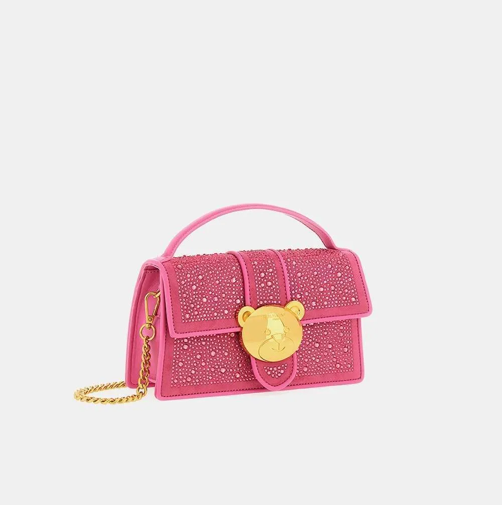 Borsa Teddy Crystal Rue Madam a tracolla con strass e chiusura orsetto. Tracolla removibile in ecopelle e catena.