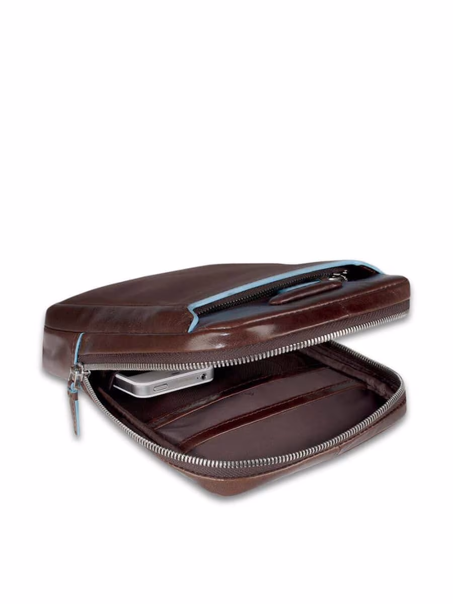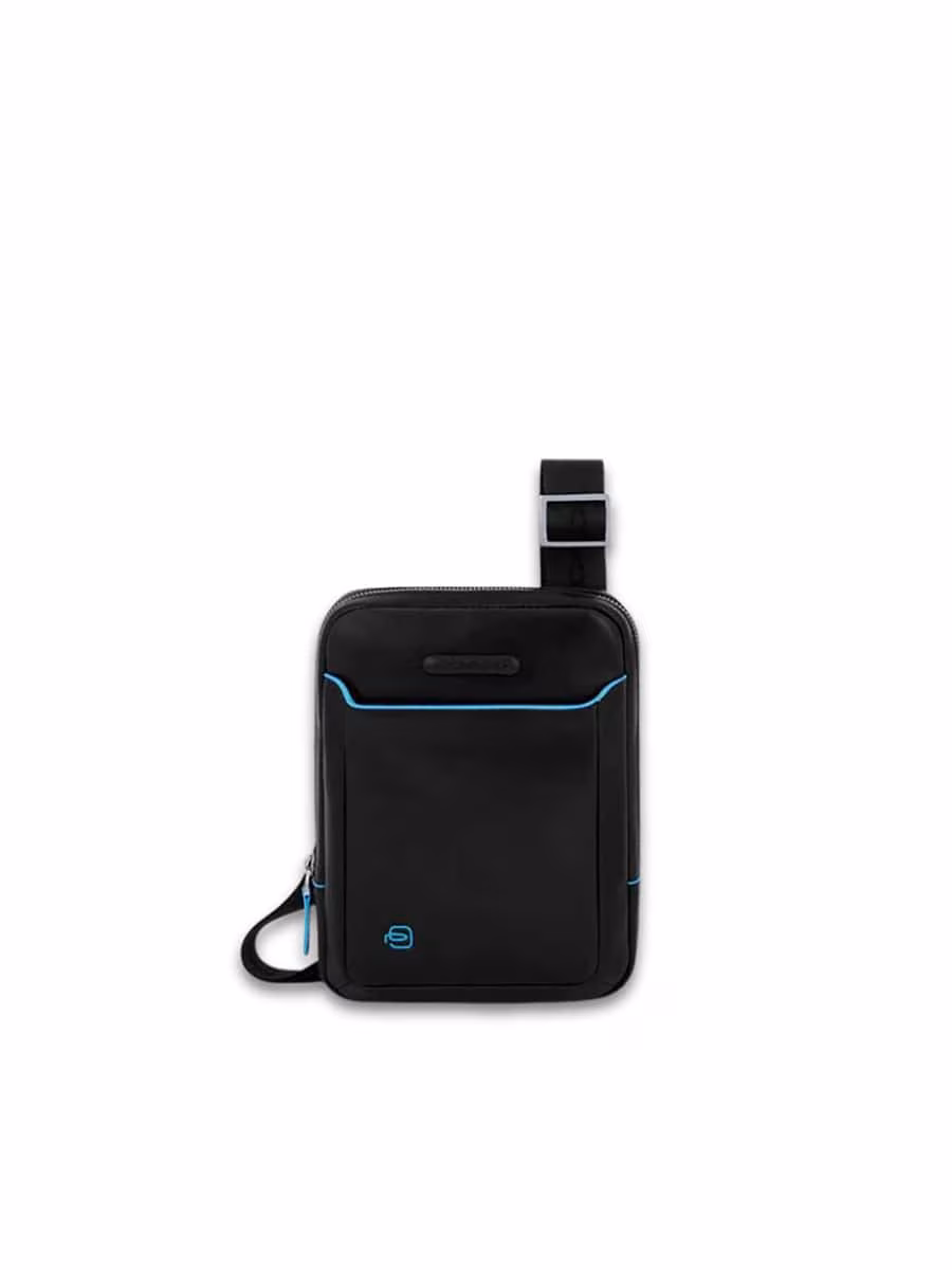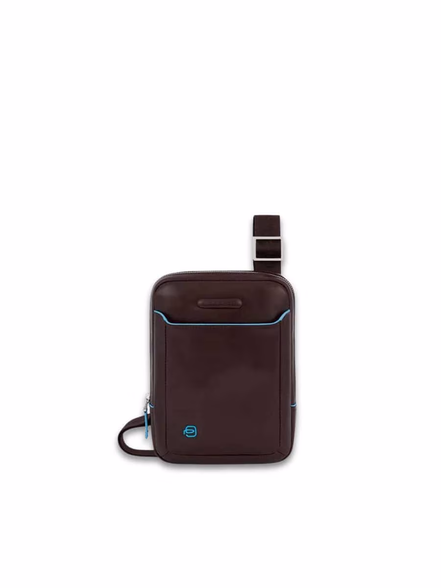 Scopri il borsello Piquadro della linea Blue Square, in pelle con finiture azzurre, tracolla regolabile e scomparto interno per iPad Mini.