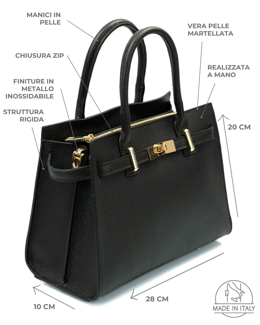 Scopri l’eleganza senza tempo della borsa a mano in vera pelle martellata colore nero con tracolla modello Celine firmata Doppia Pelle, realizzata in vera pelle di vitello martellata e interamente Made in Italy. Un accessorio iconico che unisce qualità artigianale e design sofisticato, perfetto per dare un tocco di classe a qualsiasi look.