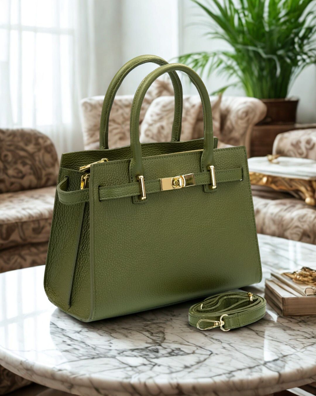 CELINE Borsa a mano in vera pelle martellata colore verde militare con tracolla