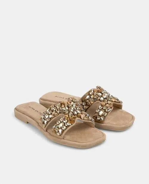 Ciabatte Alma En Pena basse con fascia incrociati tempestata di strass e pietra tono su tono, punta quadrata. Altezza del tacco 1 cm.