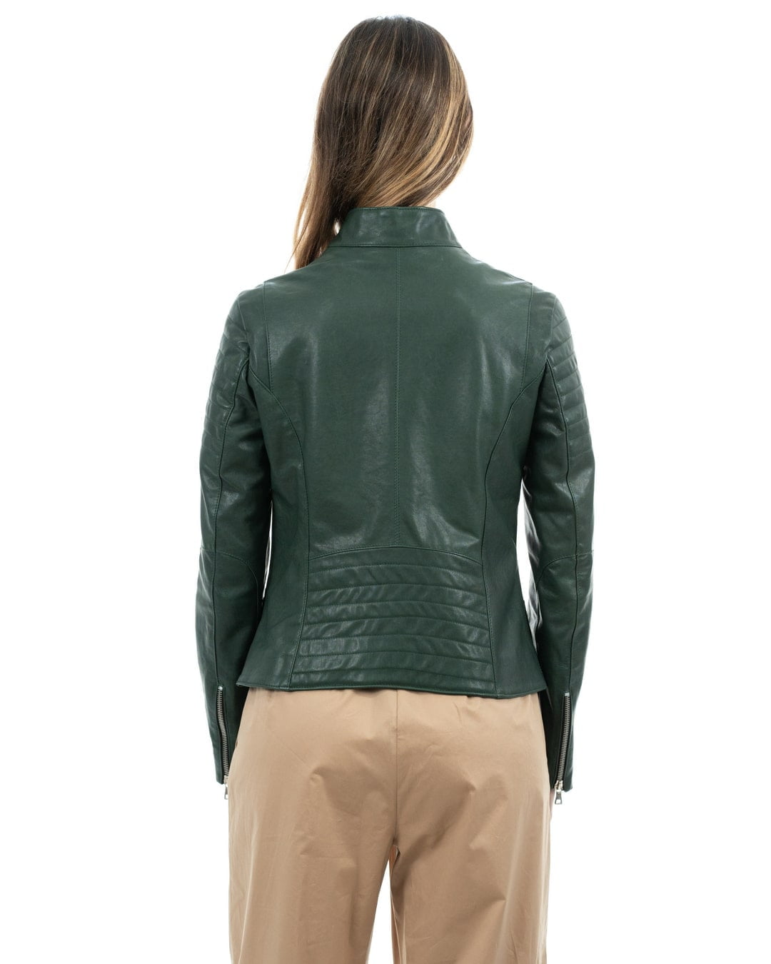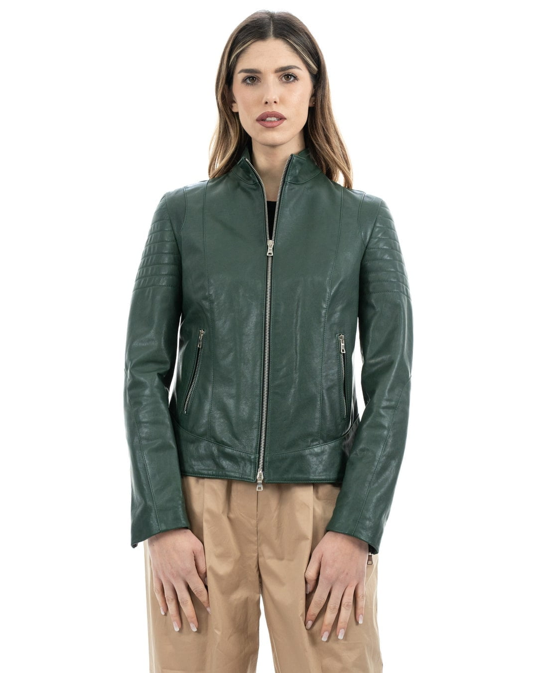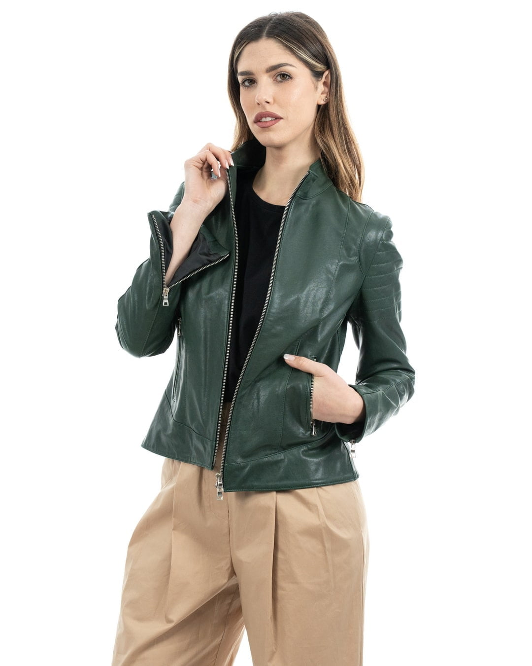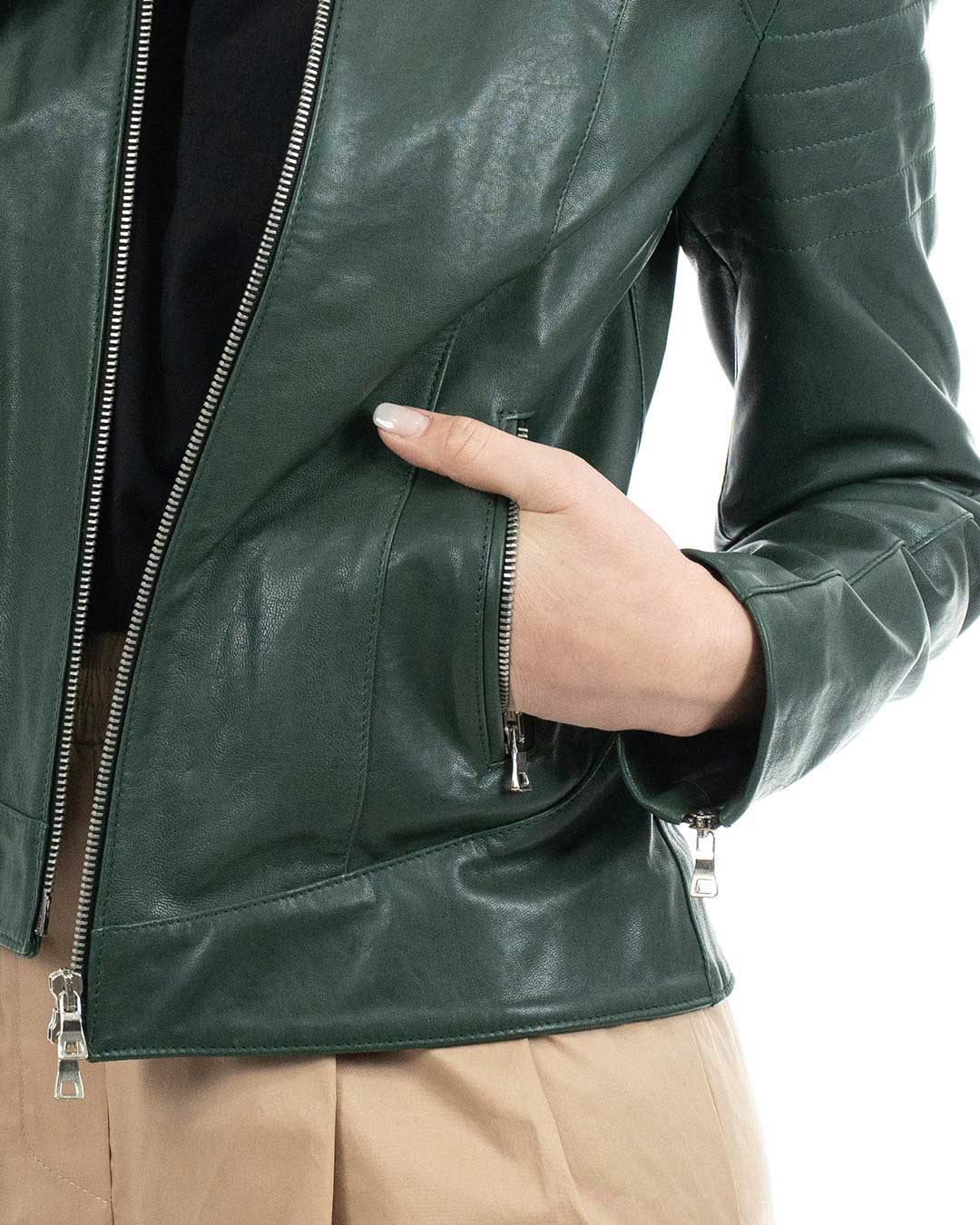 CLOE Giacca Biker da donna in vera pelle verde
