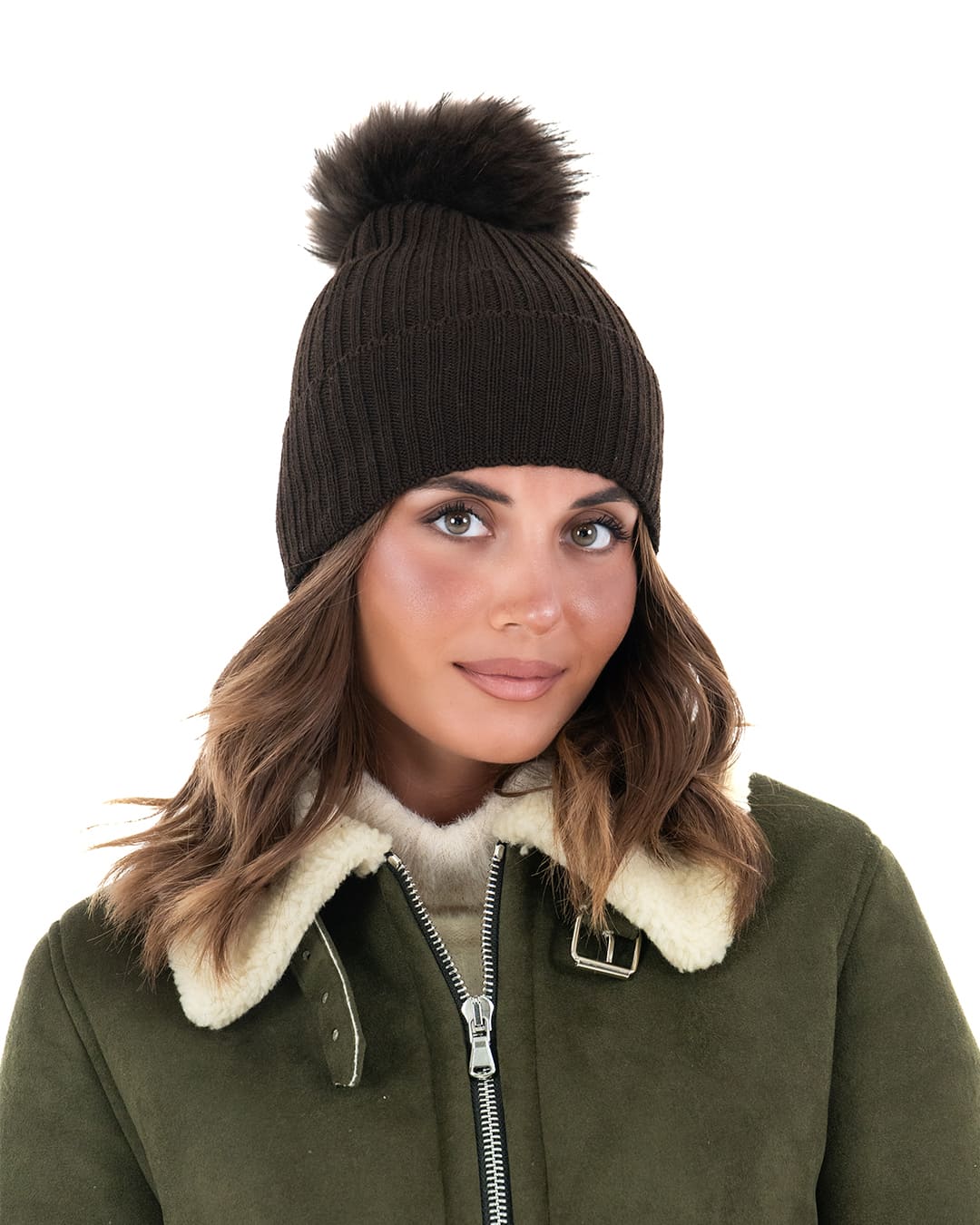 DAISY Cappello donna in lana marrone con pompon in pelliccia