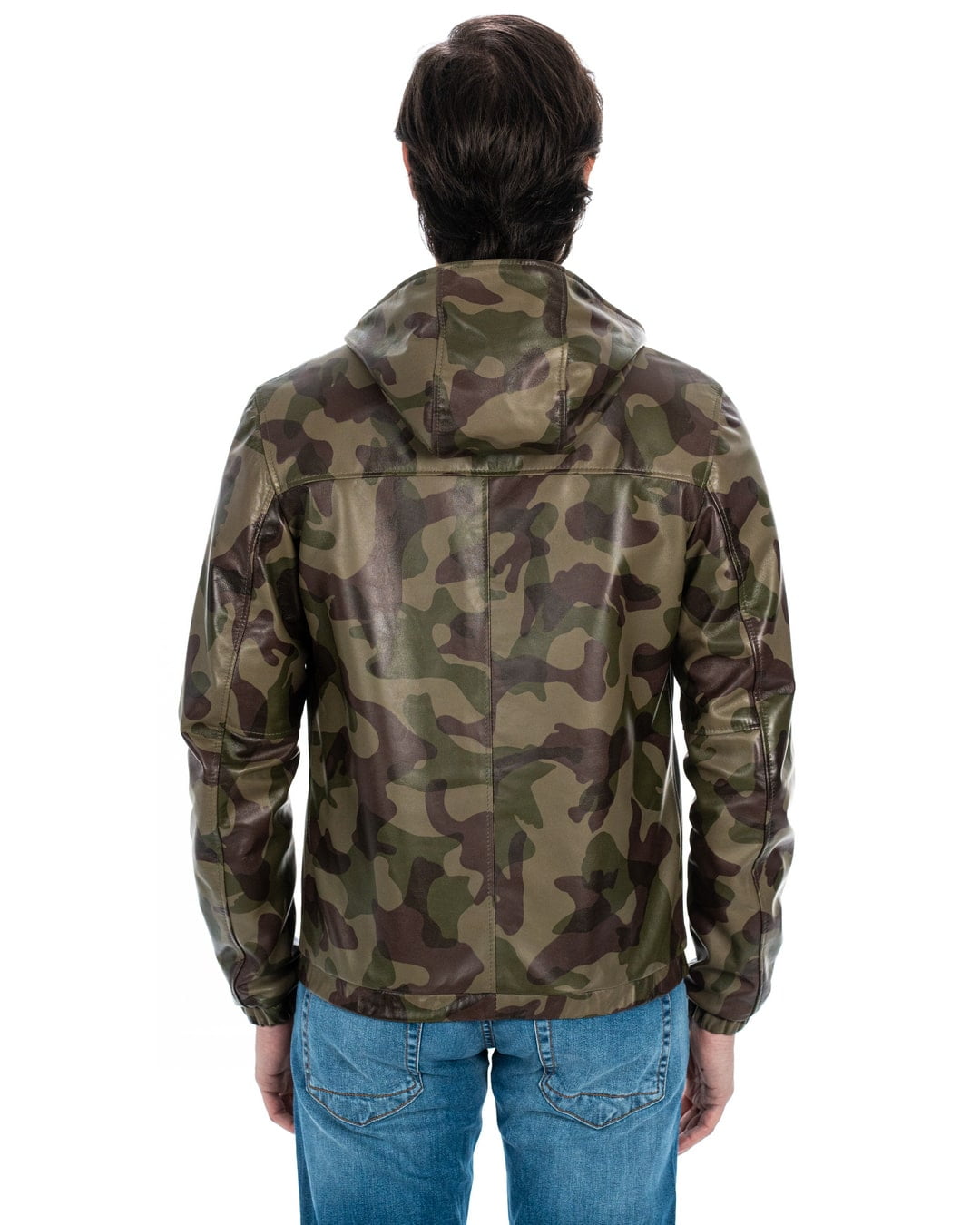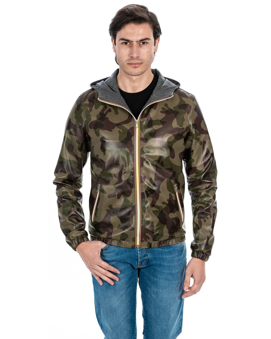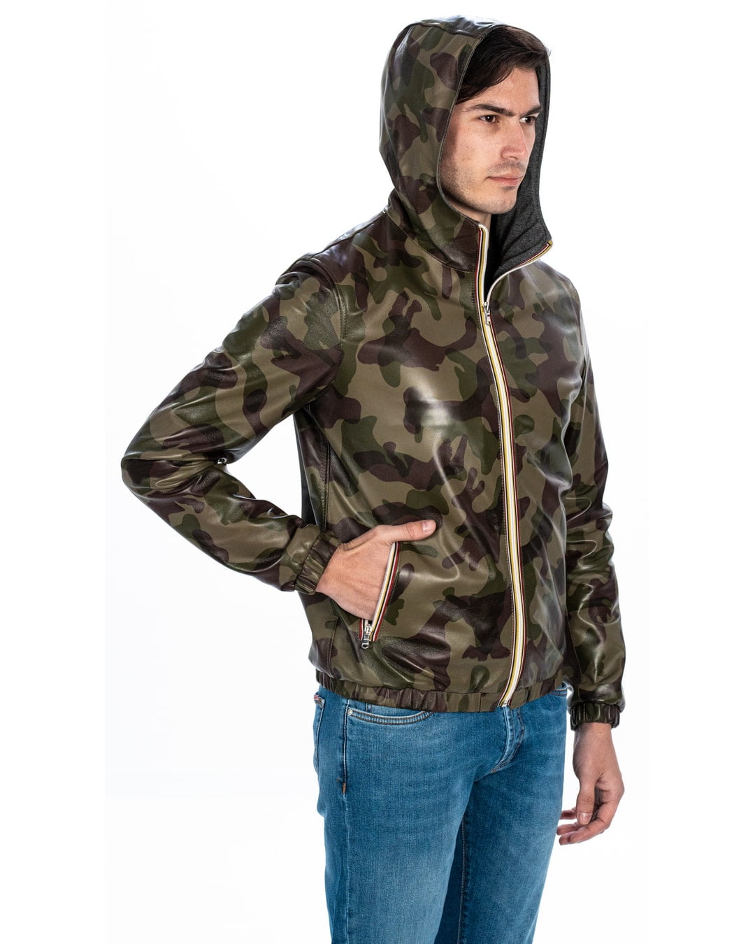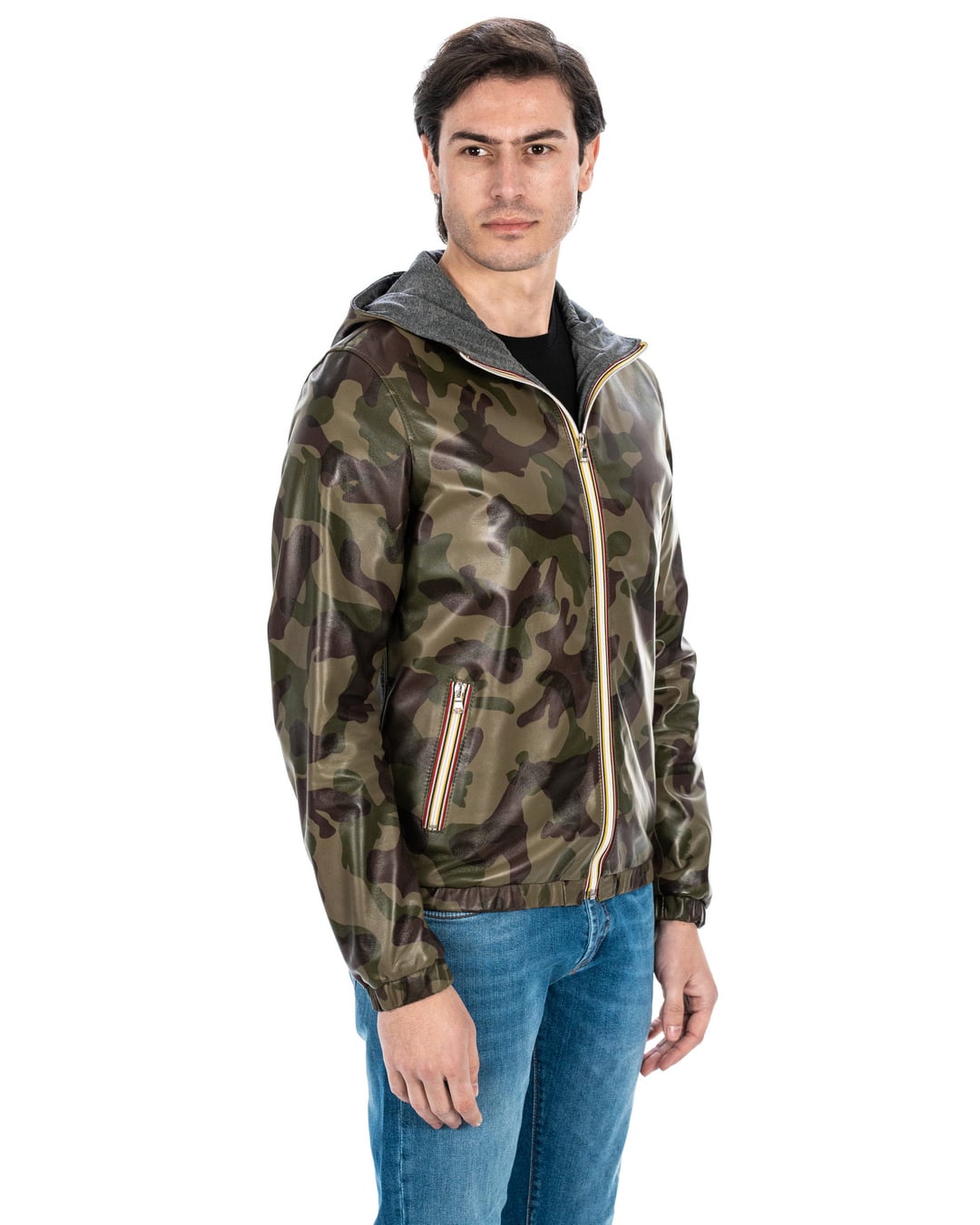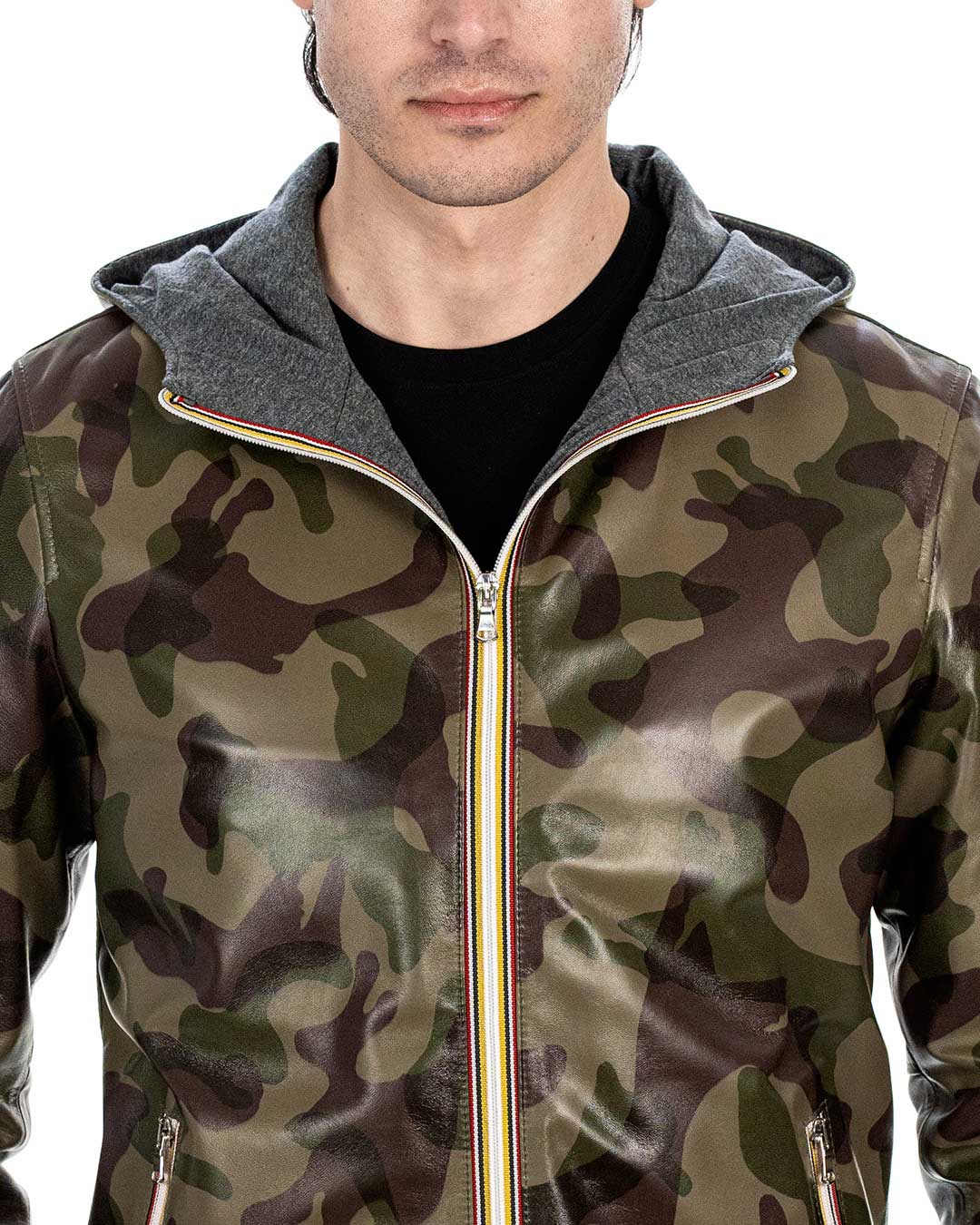 ERIC Giubbotto Bomber stile K-WAY con cappuccio da uomo in vera pelle mimetico