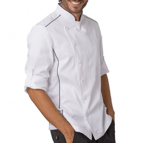 - Una giacca da cuoco con collo alla coreana e inserti in tessuto traspirante.