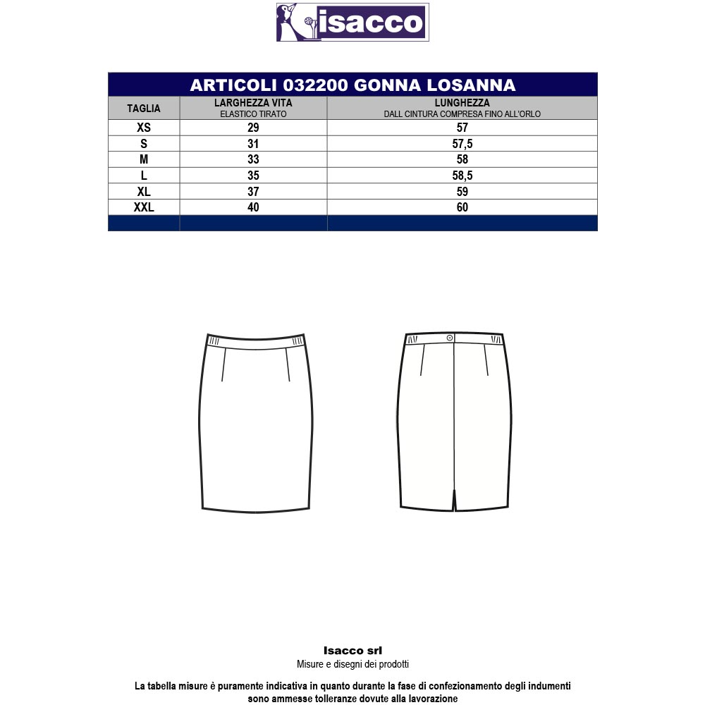 In sintesi, la Gonna Losanna ISACCO 032201/02 è un capo d’abbigliamento professionale che unisce design elegante e praticità per soddisfare le esigenze delle donne che lavorano nel settore alberghiero e del servizio in sala. Scegli questa gonna per garantire un look professionale impeccabile in ogni occasione.