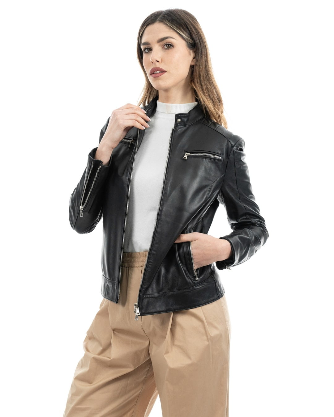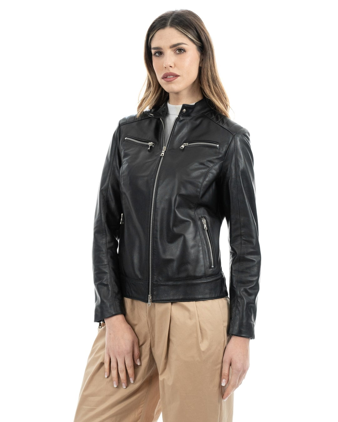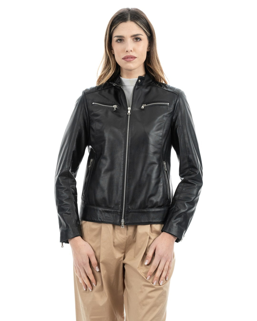 - Pelle effetto Liscio: Realizzata con pelle di agnello effetto liscio, questa giacca offre una sensazione morbida al tatto e un look raffinato, perfetta per tutte le stagioni.