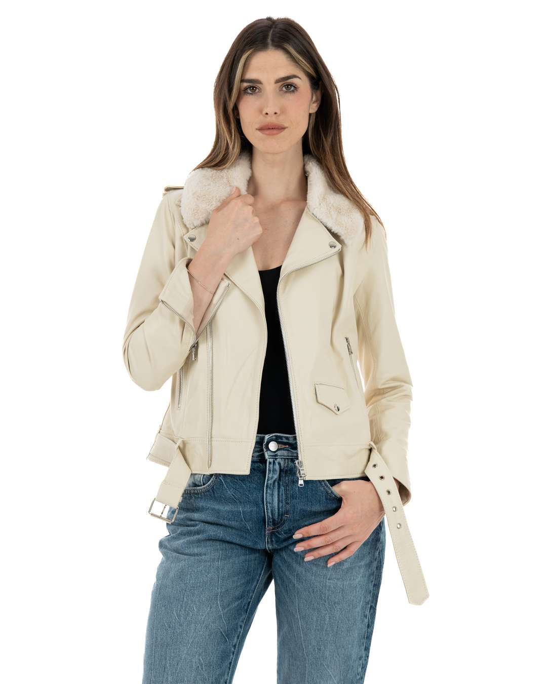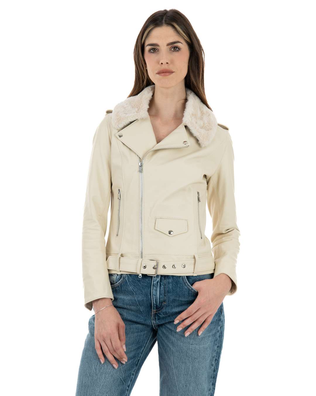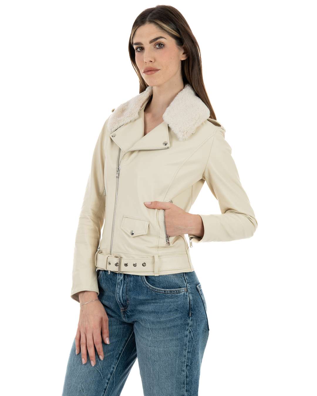 JULIA SH Giacca Chiodo con cintura da donna in vera pelle panna