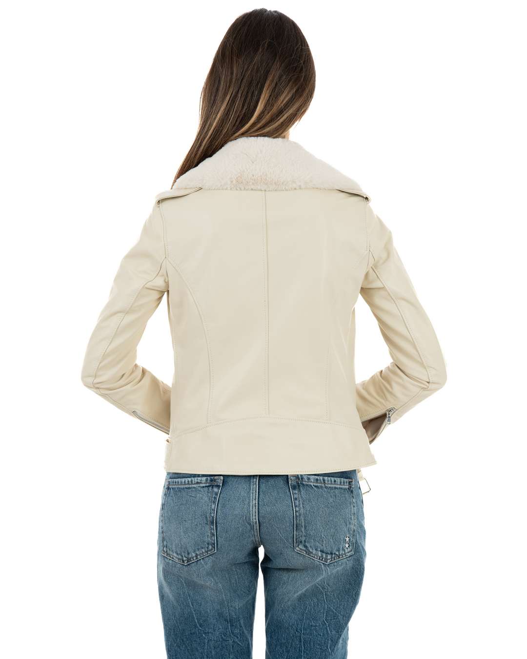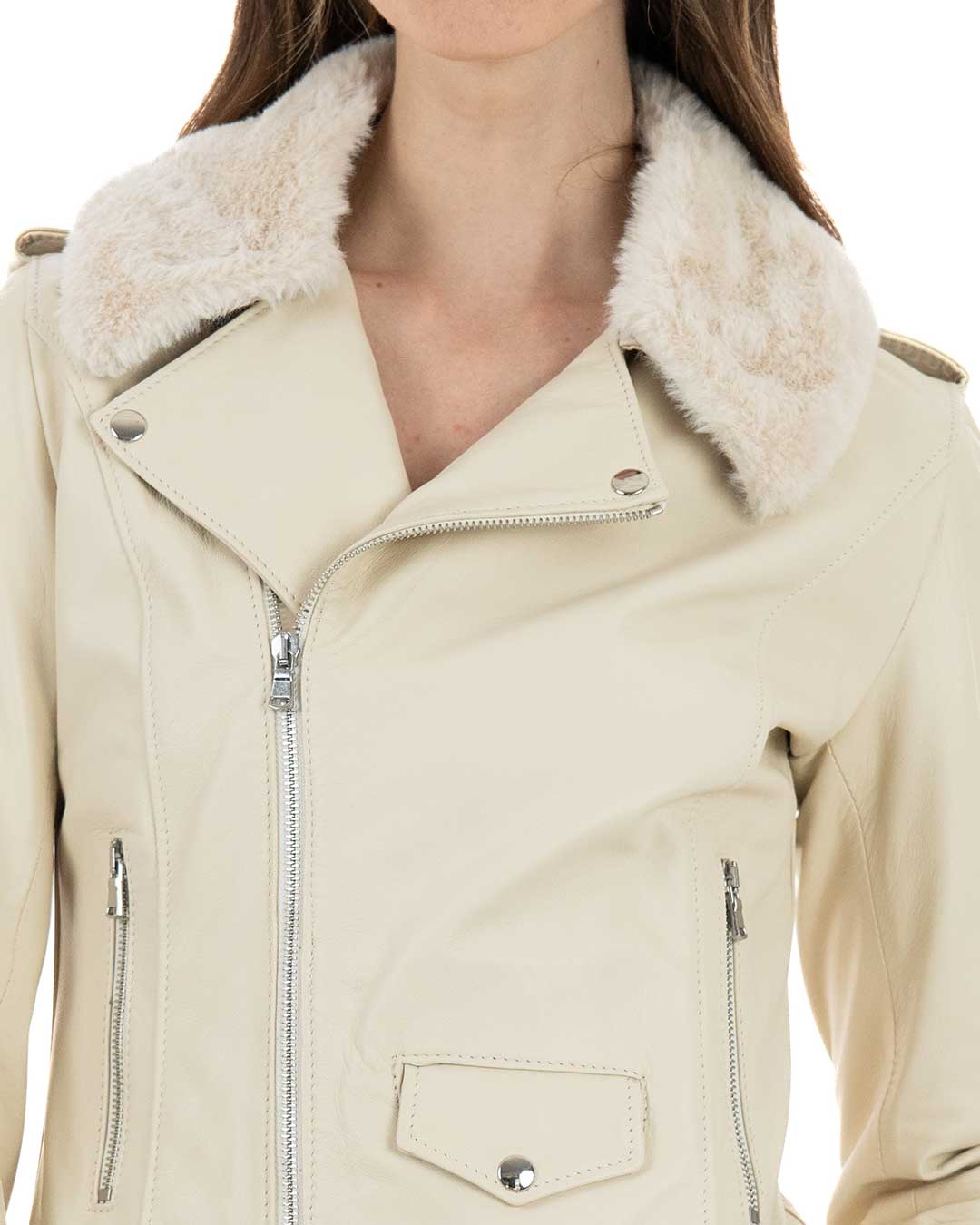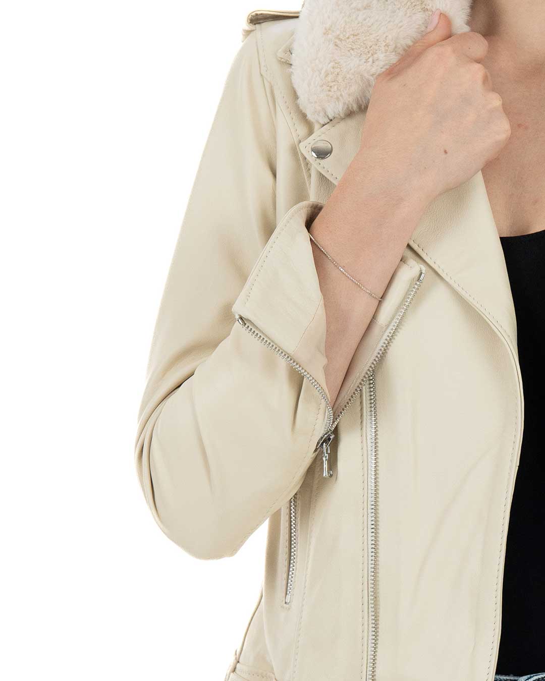 JULIA SH Giacca Chiodo con cintura da donna in vera pelle panna