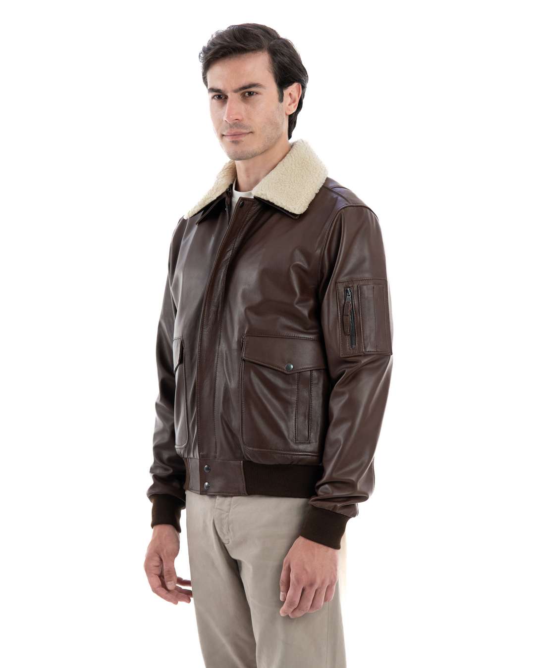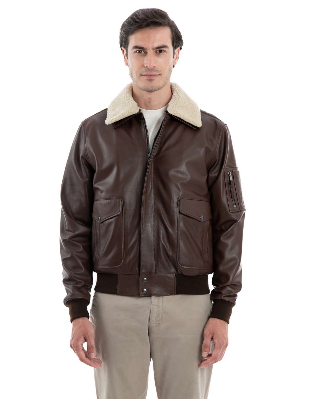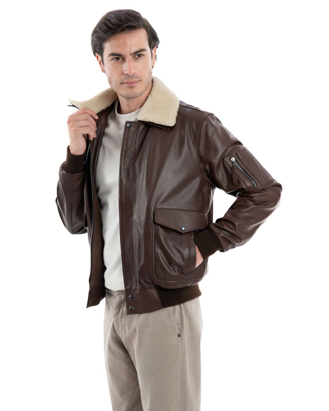 Il Giubbotto Bomber Aviatore Top Gun da Uomo Modello MAVERICK SH rappresenta l’unione perfetta tra l’audacia del design aviatore e la raffinatezza della pelle. Realizzato artigianalmente in Italia, questo giubbotto in pelle marrone è ideale per chi cerca un capo che combina stile e funzionalità. La qualità del Made in Italy è evidente in ogni dettaglio, garantendo un prodotto durevole e di grande impatto.