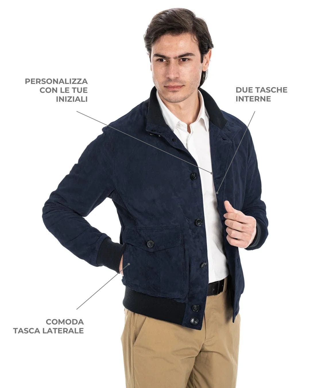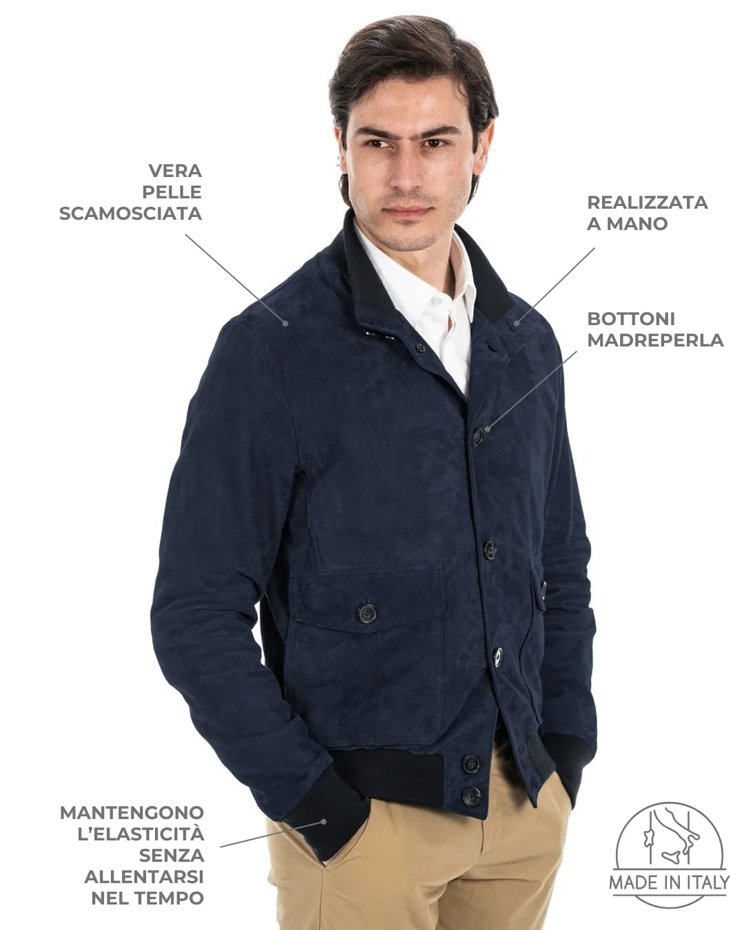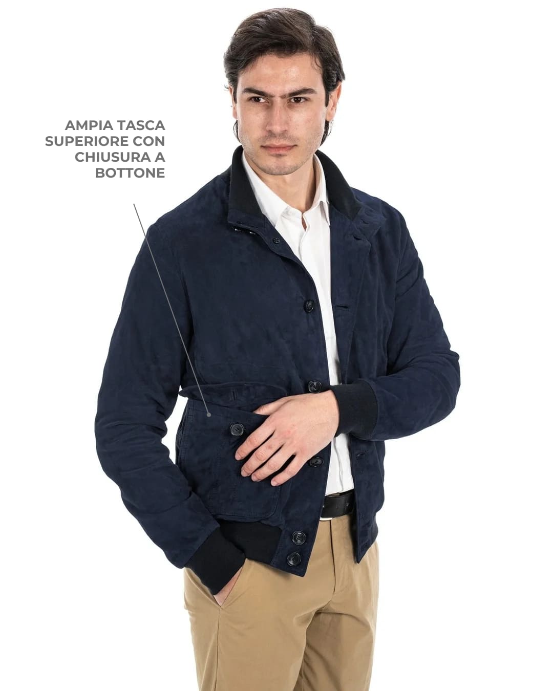 Bomber con Bottoni da Uomo in Vera Pelle Scamosciata Blu Notte – Modello OLIVER