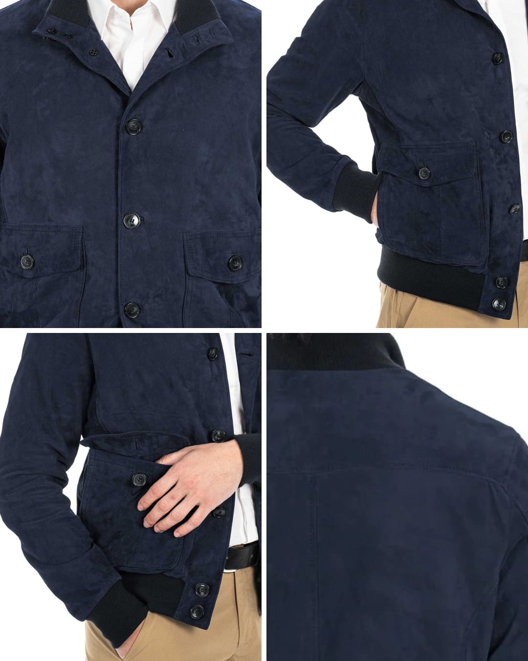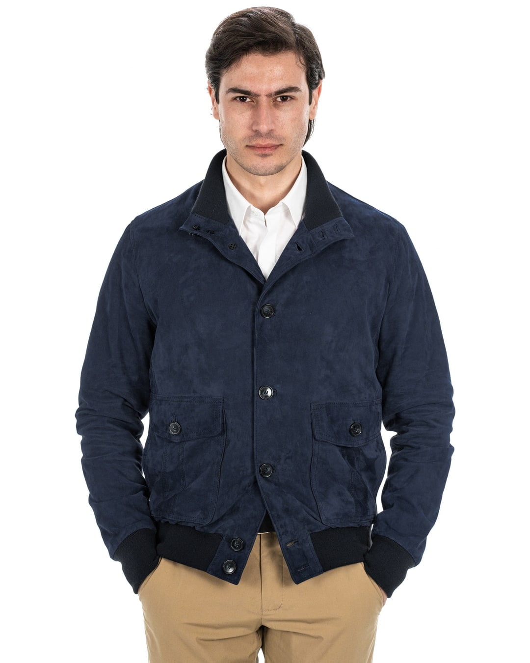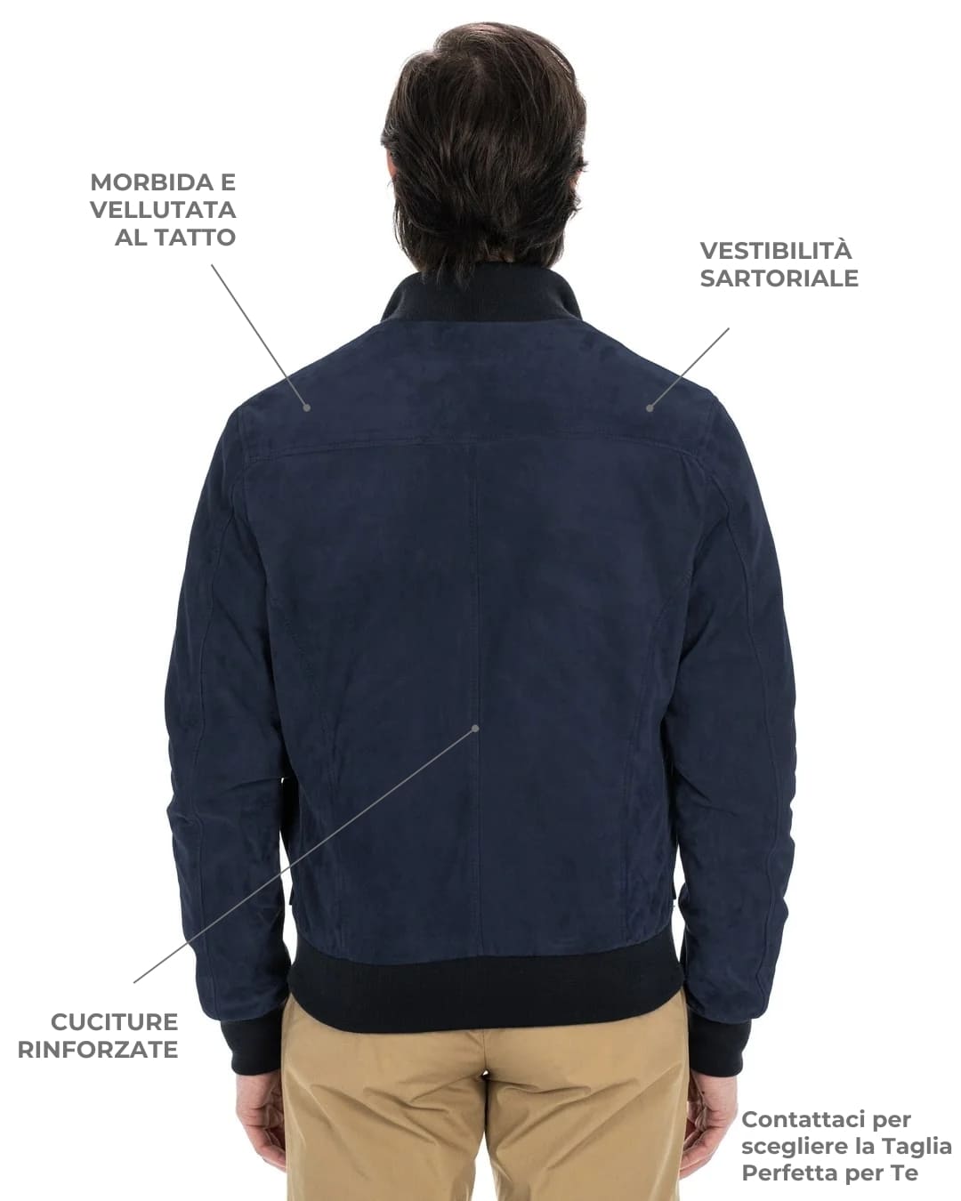 Bomber con Bottoni da Uomo in Vera Pelle Scamosciata Blu Notte – Modello OLIVER
