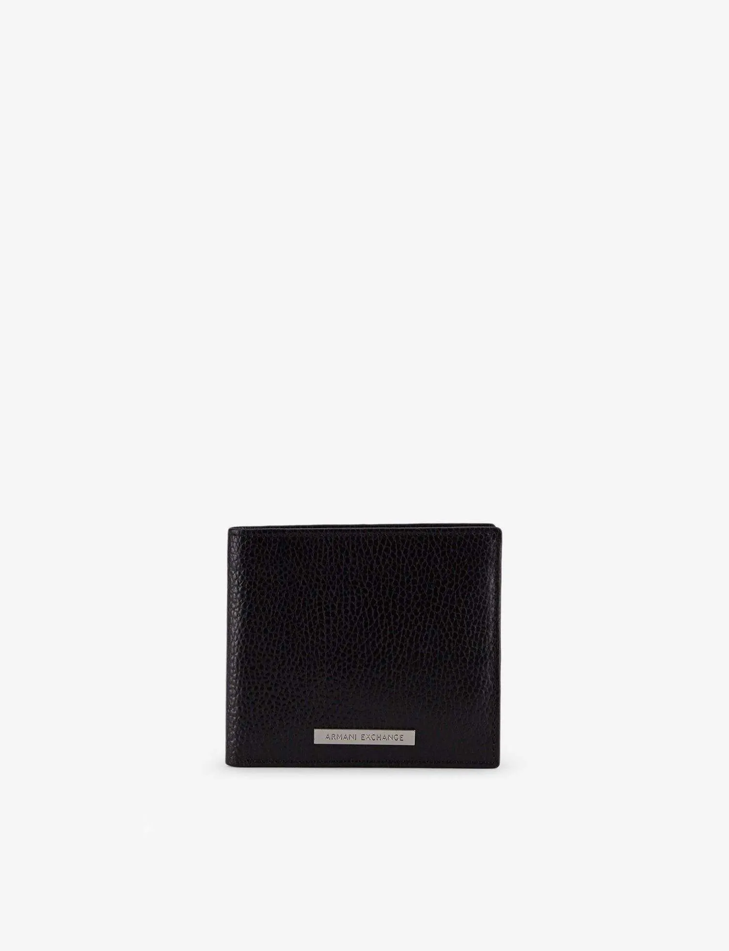La virile matericità della pelle di bufalo caratterizza il portafoglio a due falde. Completa il modello la targhetta in metallo con scritta logo impressa.