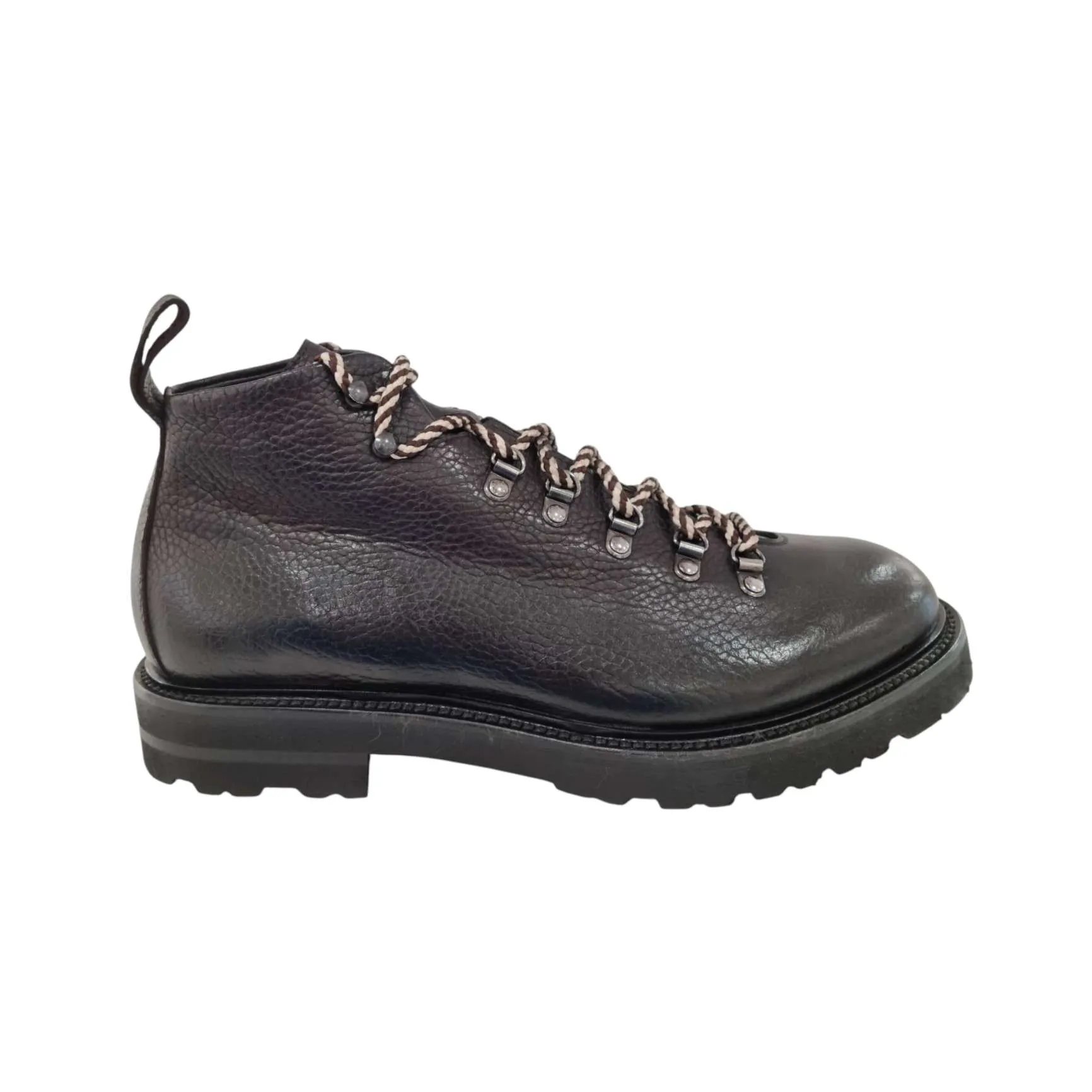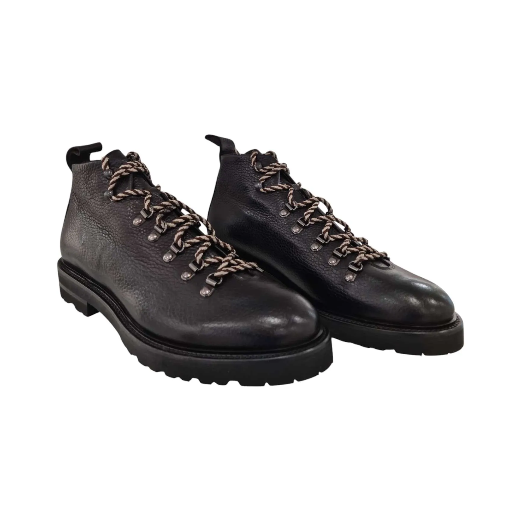 Polacchino Crisci in pelle martellata, con lacci trekking, ganci metallici e suola carrarmato. Robusto, confortevole e perfetto per uno stile urbano.