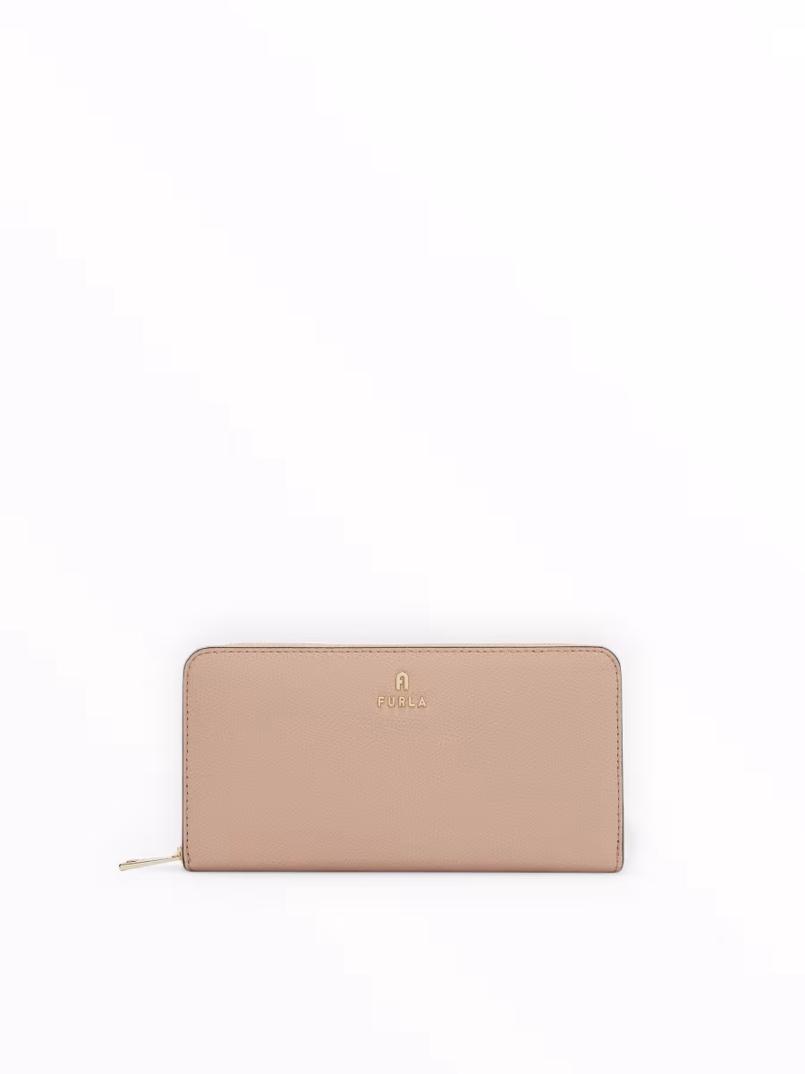 Capiente ed elegante, il portafoglio continental Furla Camelia offre tutto lo spazio necessario ad ospitare banconote e documenti grazie alla divisione interna con doppio scomparto. Il design ultra slim permette di riporlo comodamente in borsa e la chiusura zip around ne esalta le linee morbide con angoli smussati.