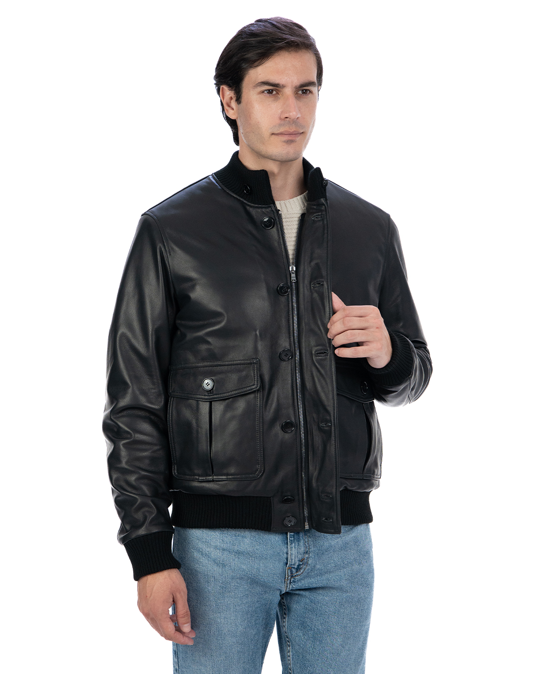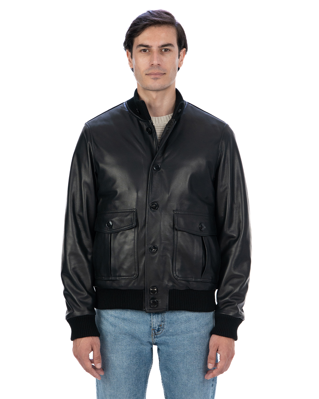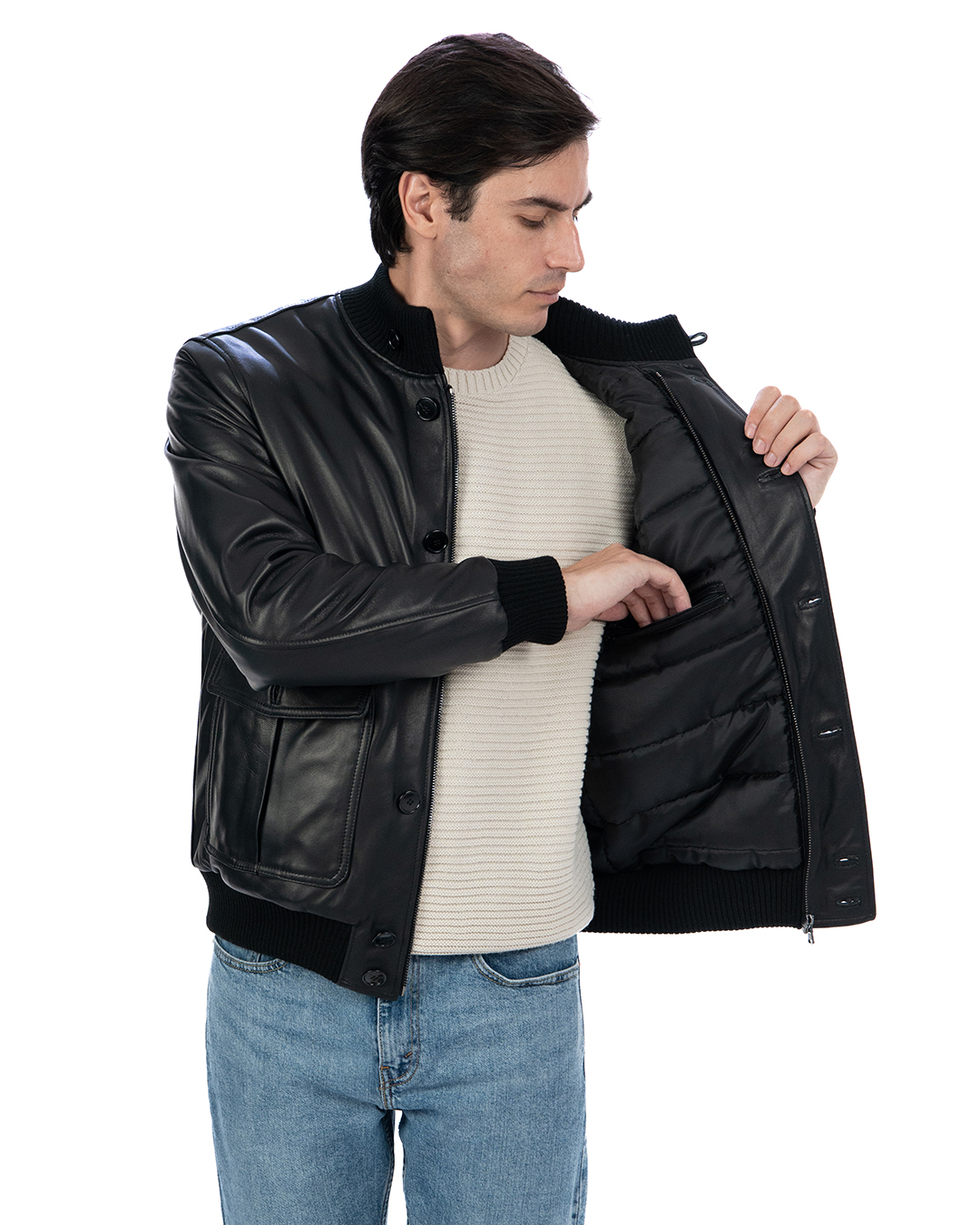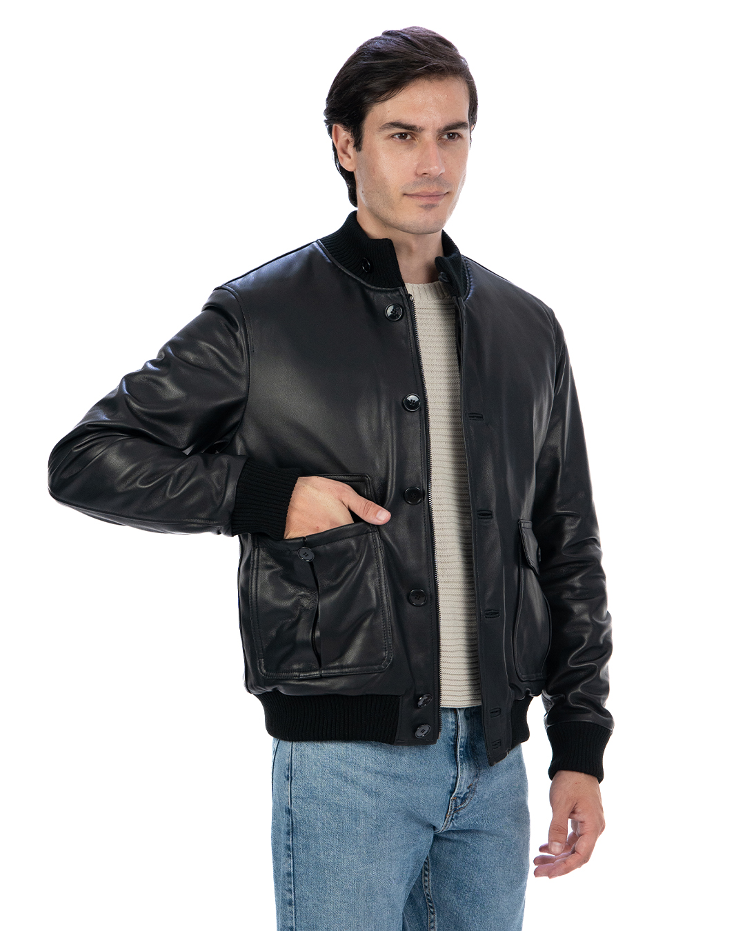 - Pelle effetto liscio: La pelle liscia conferisce al bomber un aspetto sofisticato e raffinato, ideale per essere indossato sia in occasioni casual che più formali.