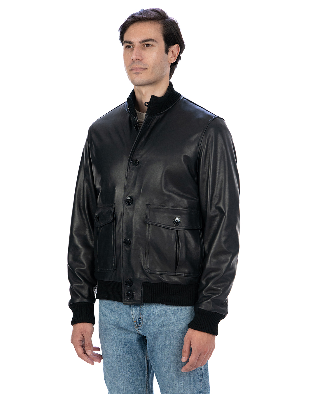 RALPH Bomber con bottoni e zip da uomo in vera pelle nero imbottito