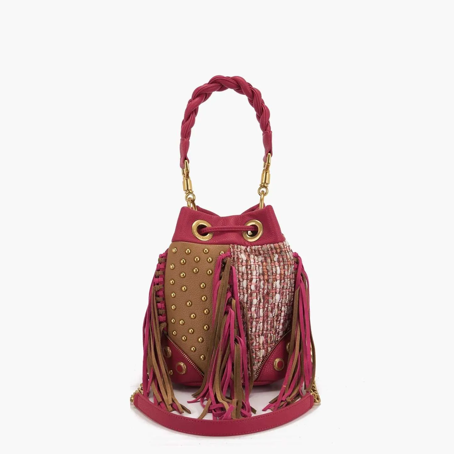 Secchiello La Carrie in ecopelle martellata e tessuto con borchie applicate e frange, manico intrecciato e tracolla in catena e ecopelle