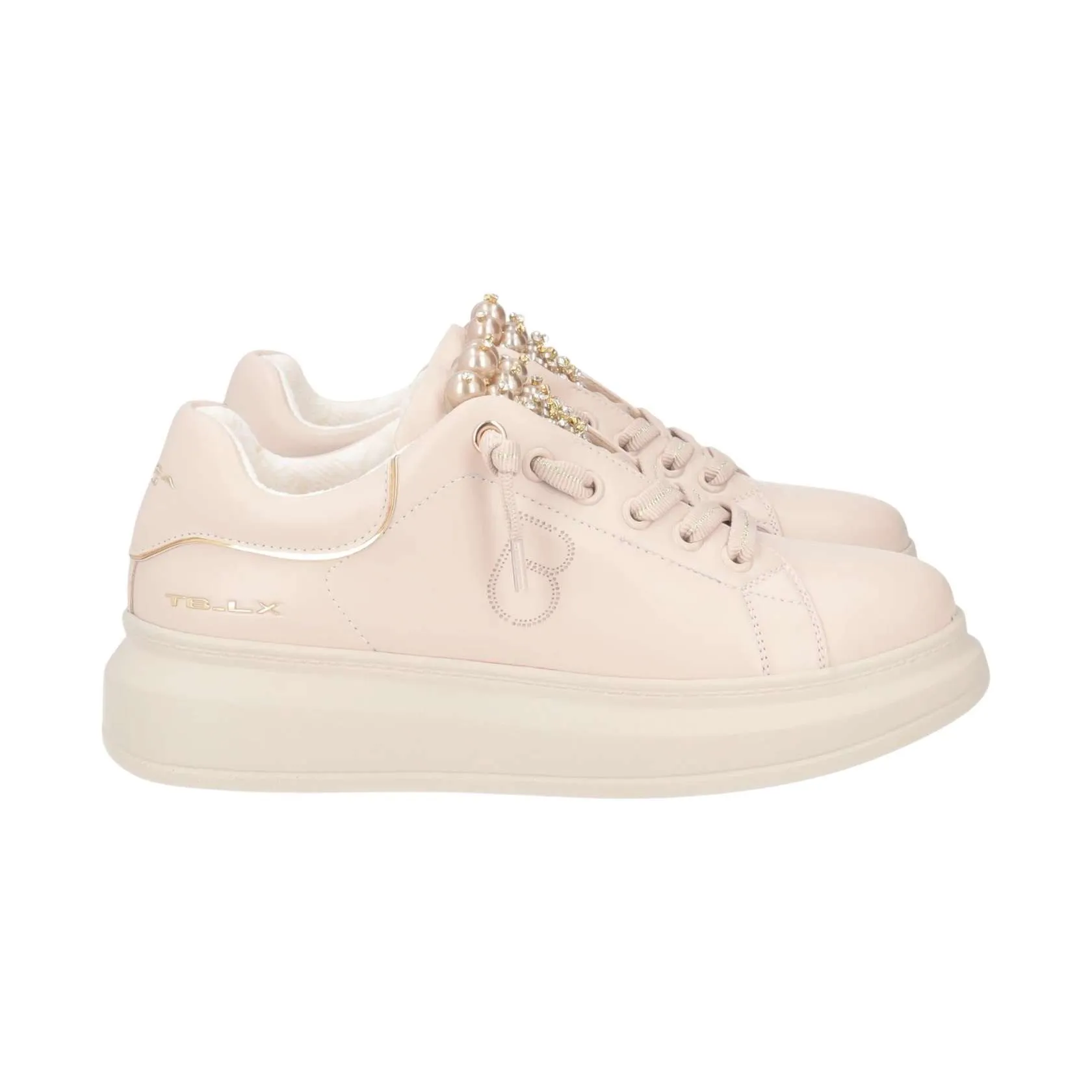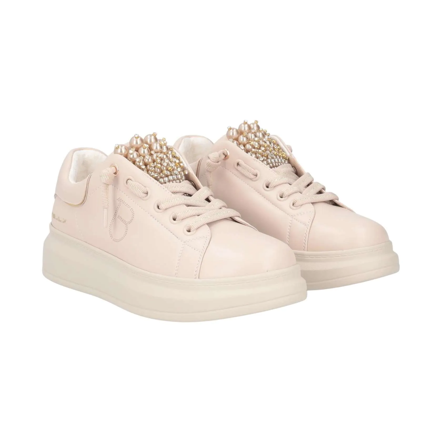 Sneakers Chic in pelle con linguetta arricchita da perle, dettagli glamour, imbottitura interna e monogramma traforato sul fianco