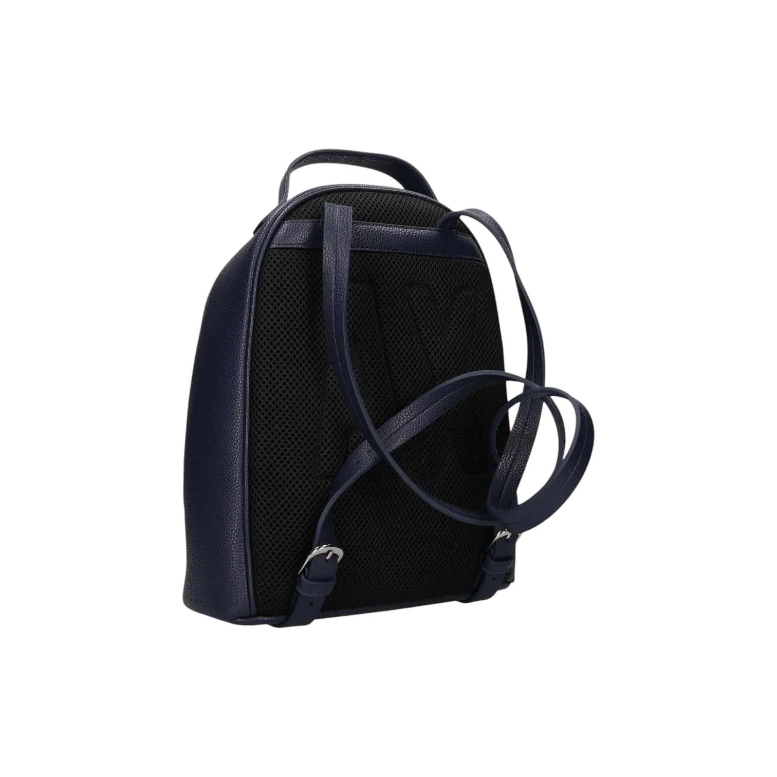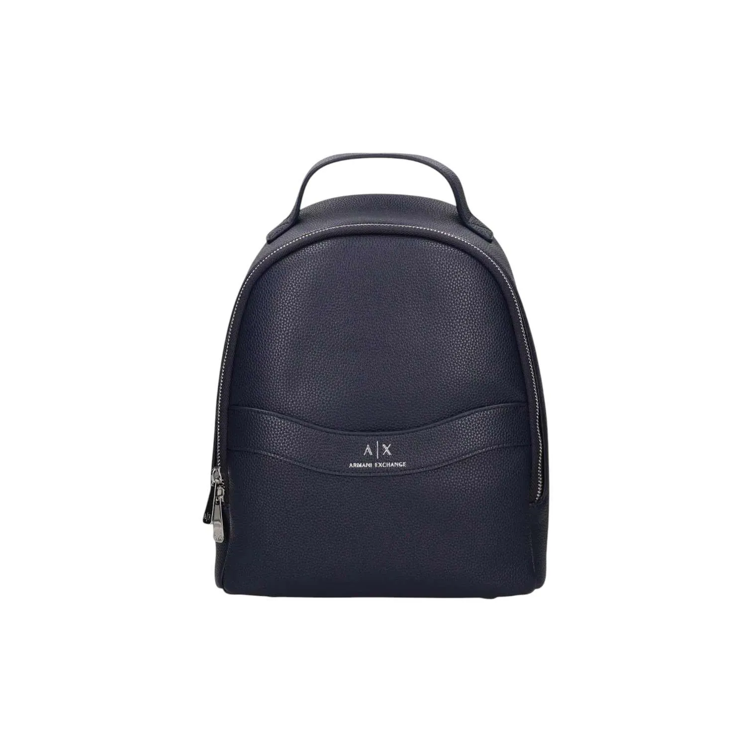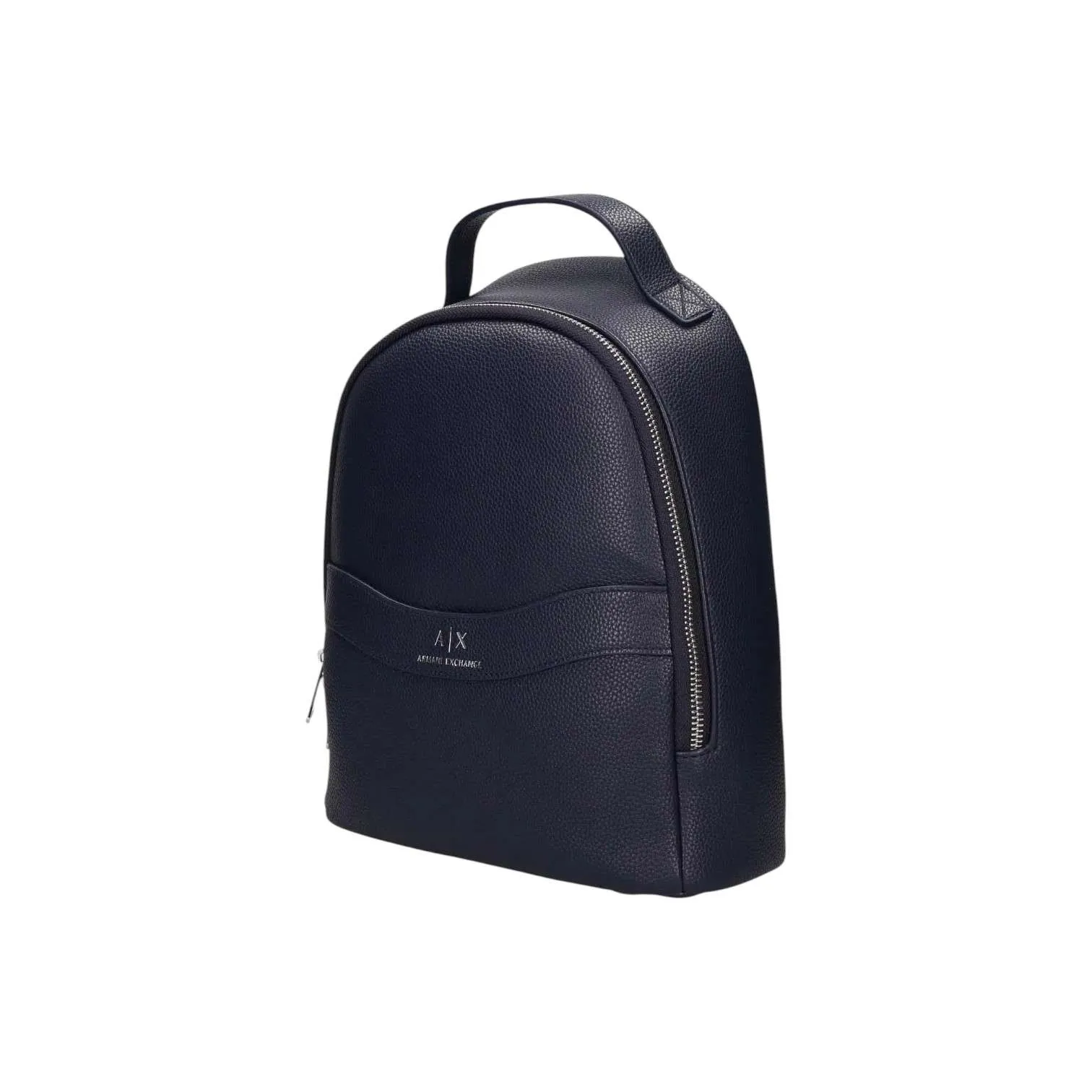 Zaino Armani Exchange blu in ecopelle con logo sulla tasca frontale, retro imbottito. Design moderno e compatto, ideale per look casual e urbani.