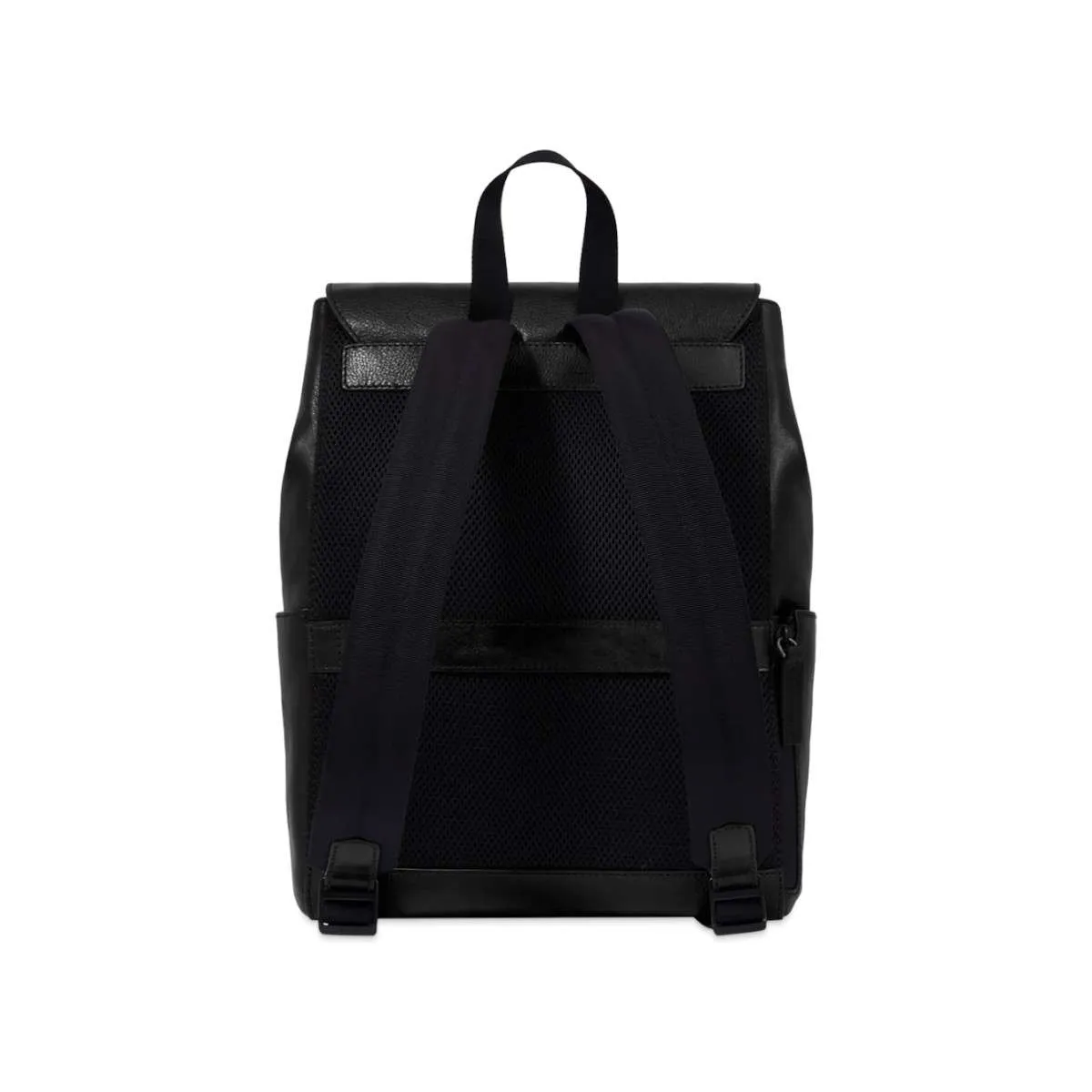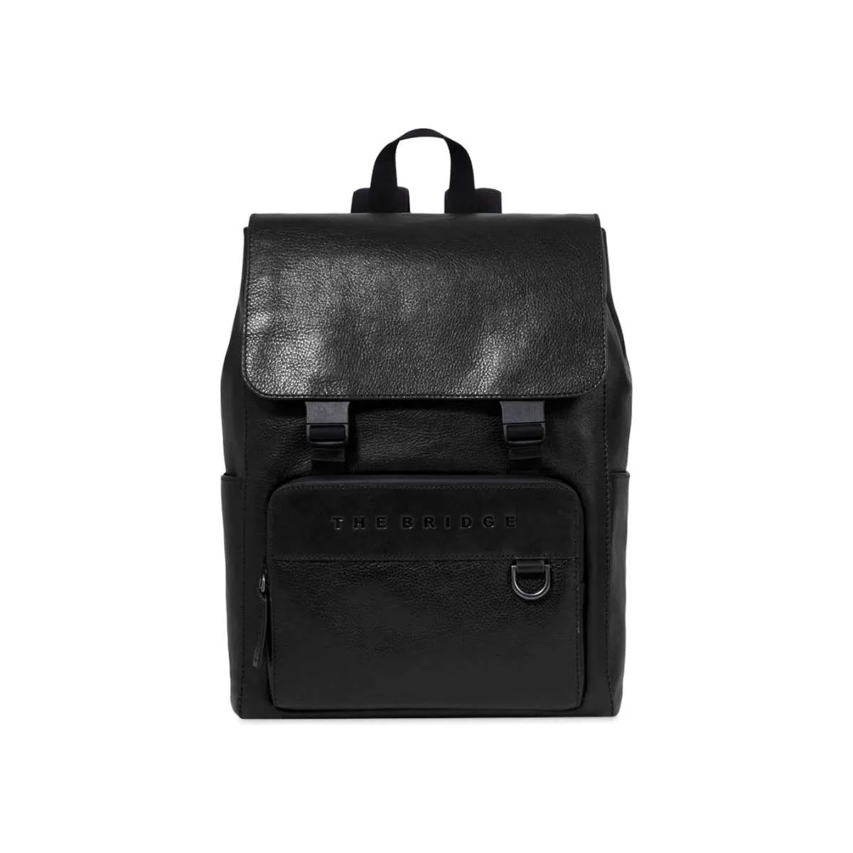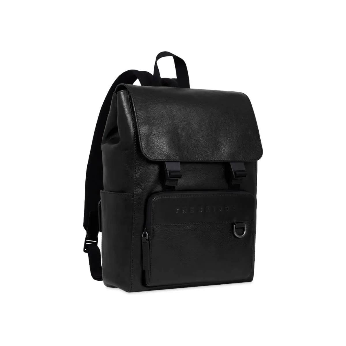 Zaino Damiano The Bridge in pelle nera, elegante e funzionale. Con tasca frontale, chiusura a patta e dettagli metallici. Perfetto per lavoro e città.