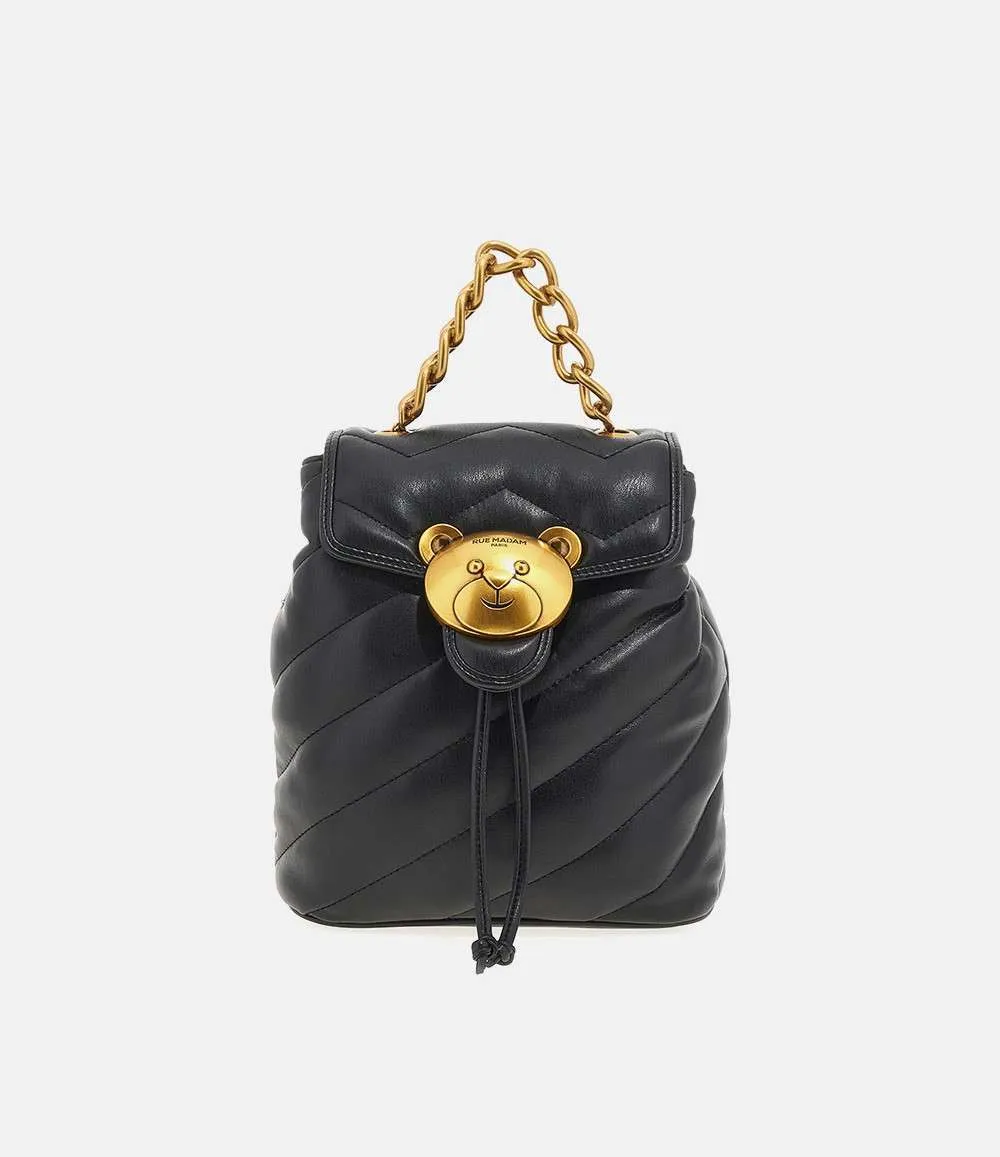 Zaino Puffy trapuntato nero con manico a catena dorata e chiusura orsetto. Firmato Rue Madam Paris, elegante e moderno per ogni occasione.