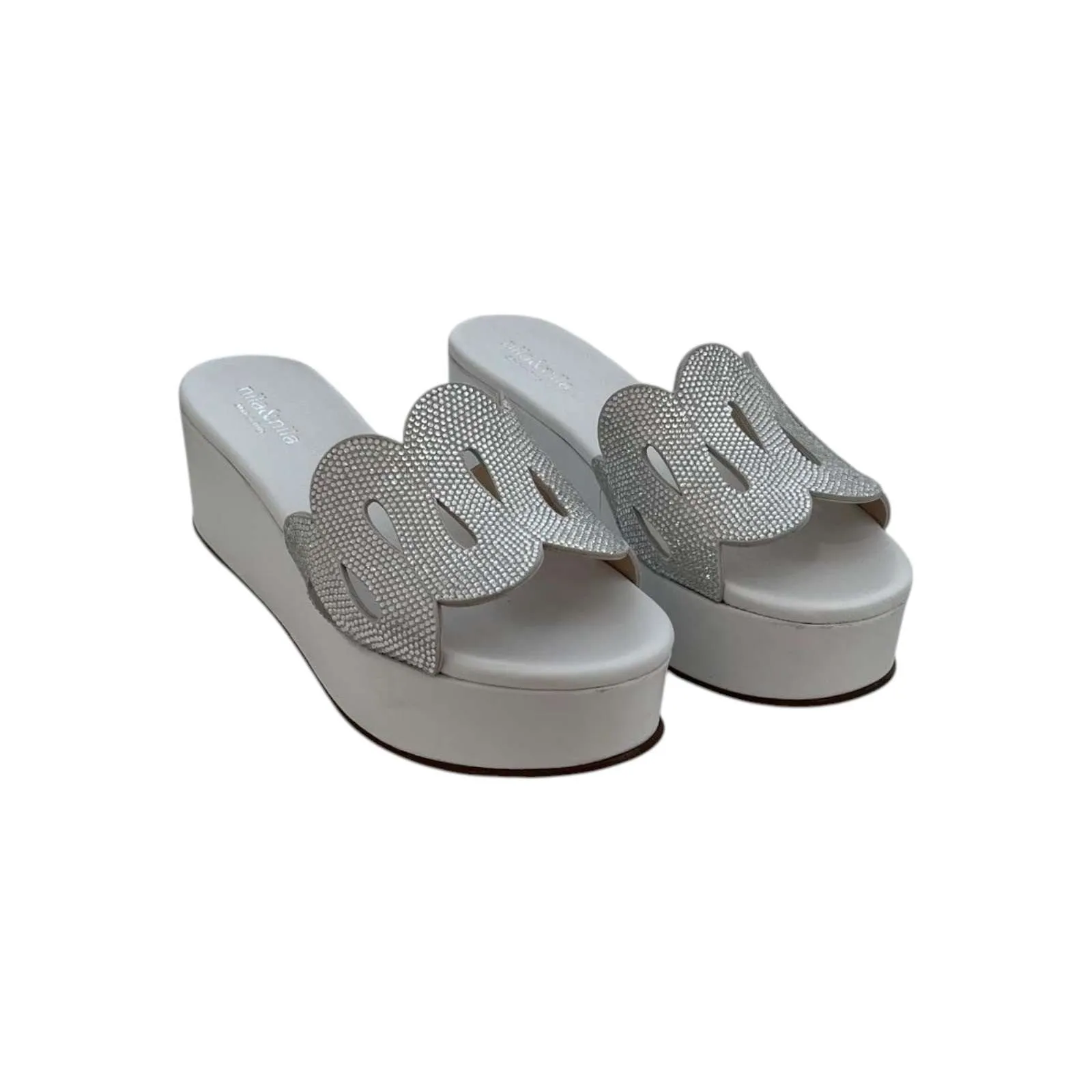 Zeppa realizzata in morbida pelle, senza cinturino, con strass argento sulla fascia, plantare in pelle imbottito per un confor maggiore