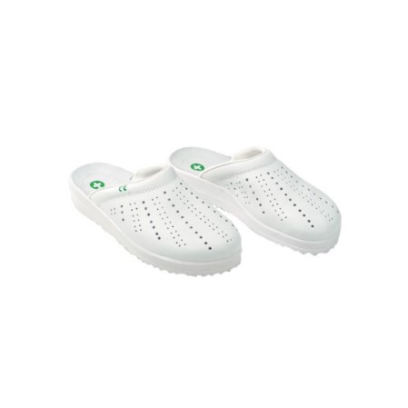 - Uno zoccolo in pelle forata traspirante da donna, di colore bianco.